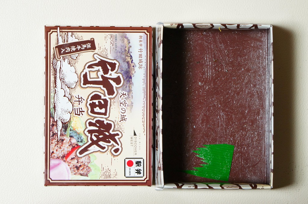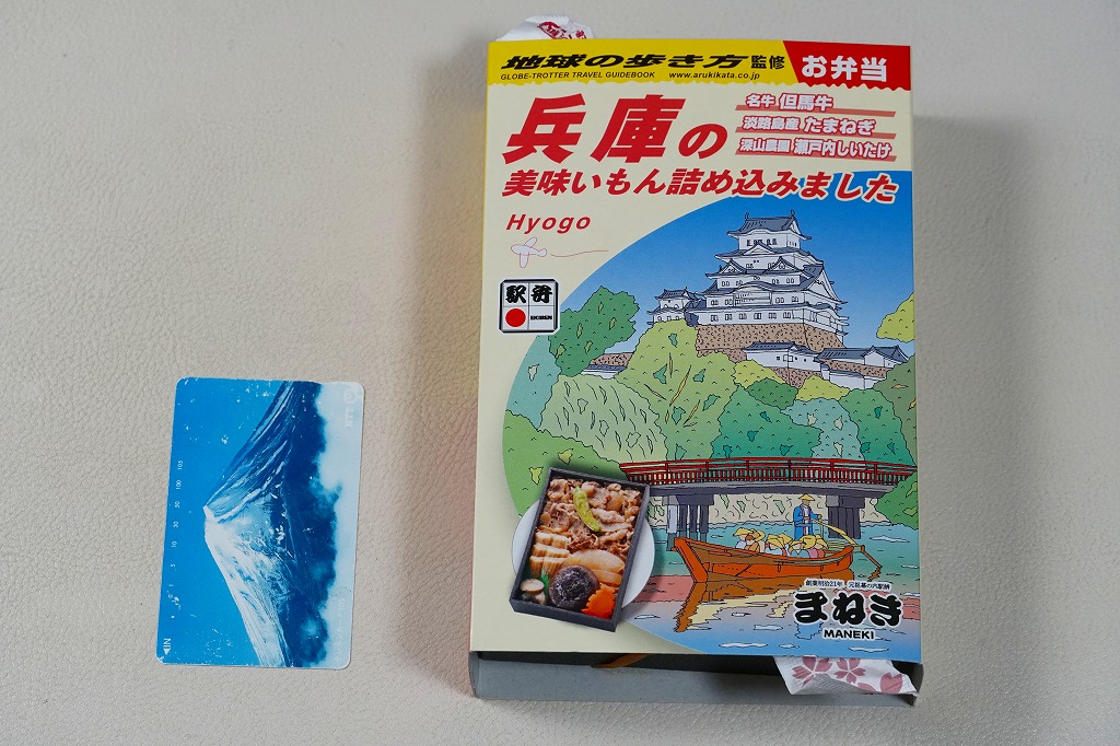 おおよそ弁当のものには見えないスリーブの絵柄は、該当のガイドブックと同じもので、名前を少し変えて中身の写真を加えた。長方形の容器にえきそばのだし飯を詰め、但馬牛のごぼう煮、淡路島産たまねぎ煮、深山農園瀬戸内しいたけ煮、焼穴子、姫路城型にんじん、しば漬などで覆う。味でいえば、だいたい牛丼であり、姫路駅弁の各種を詰め込んだ感じ。海外旅行ガイドブックの定番で、日本中すべての書店にあると思う本がなぜか駅弁売り場に置かれているように見えて、とても目立つと思った。