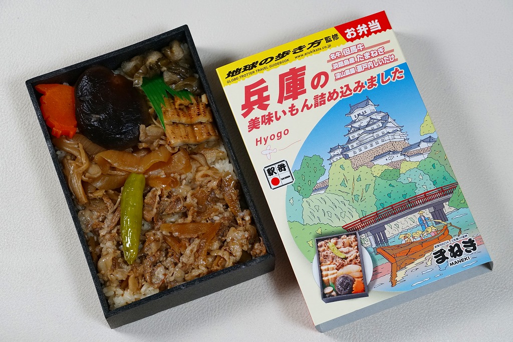 駅弁の名前は不明。現物で「地球の歩き方監修お弁当」とも「兵庫の美味いもん詰め込みました」とも読め、レシートでは「地球の歩き方兵庫」、プレスリリースでは「「地球の歩き方」監修のお弁当」とある。学研ホールディングスの旅行ガイドブック「地球の歩き方兵庫」の発売を記念し、調製元とのコラボレーションにより2025(令和7)年8月28日に姫路駅で、9月1日に東京駅で発売。