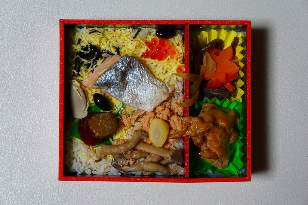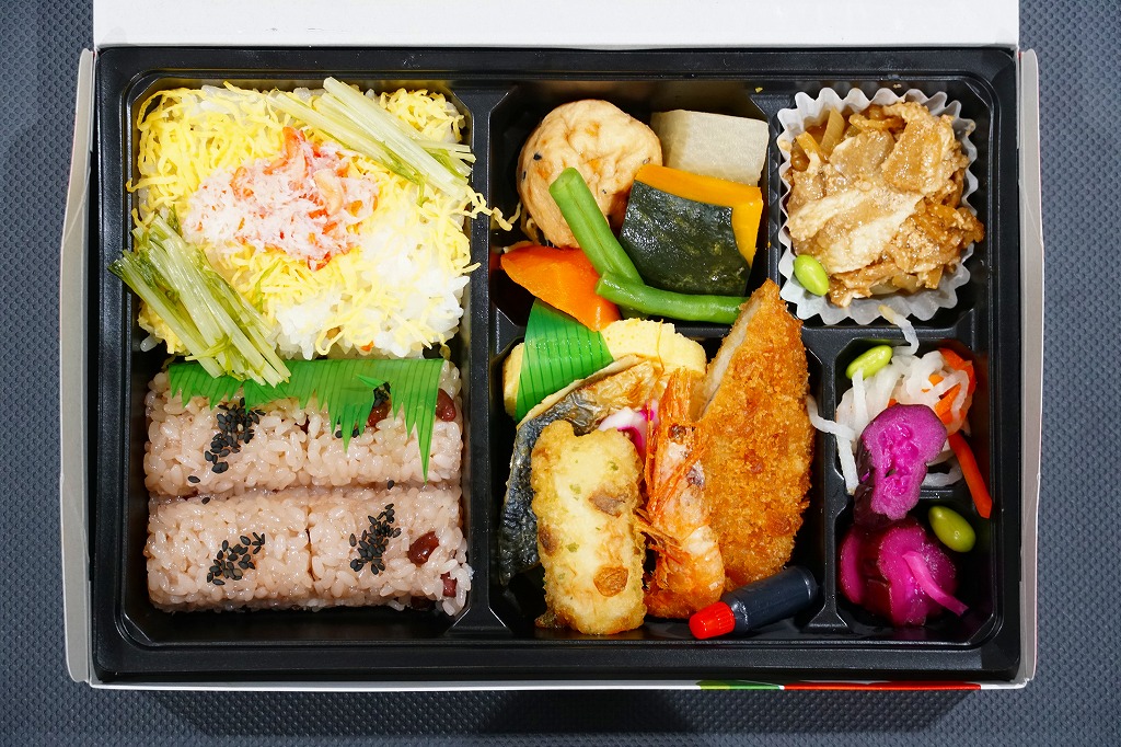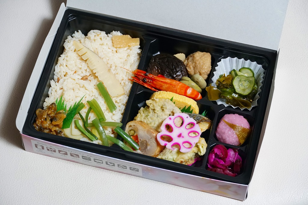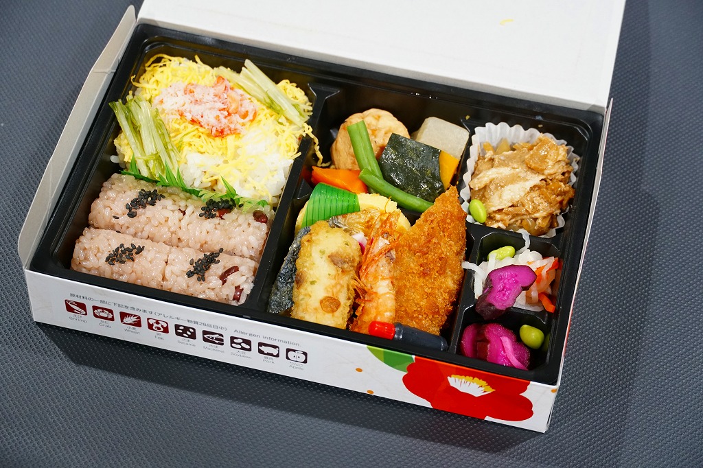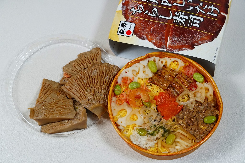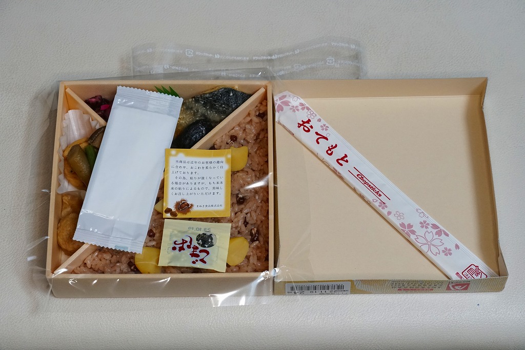 2010年代か、それ以前から存在していた商品か。もとは調製元の仕出し弁当店ブランド「味三昧」で取り扱われ、のちに駅弁売店で出てきたのではないかと思う。ふたに商品名を描いた細身の容器は、長方形3個分。その左右に栗を載せた花形の赤飯と、アナゴやシイタケなどのちらし寿司を据え、中央に鶏照焼、高野豆腐、こんにゃく煮、小松菜漬、玉子焼、かに風味蒲鉾などのおかずや付合せ。駅弁の発想では生まれないようにみえる、軽食以上の分量を持つ小箱。価格は2017年時点で600円、2023年時点で700円、2024年時点で780円、2025年時点で880円。