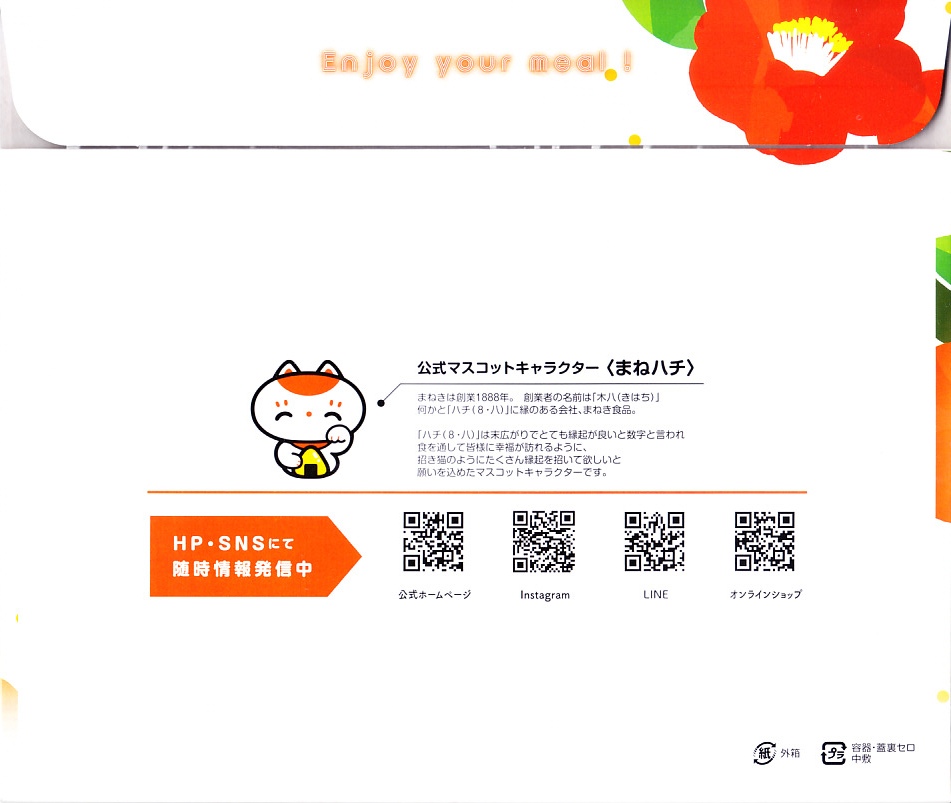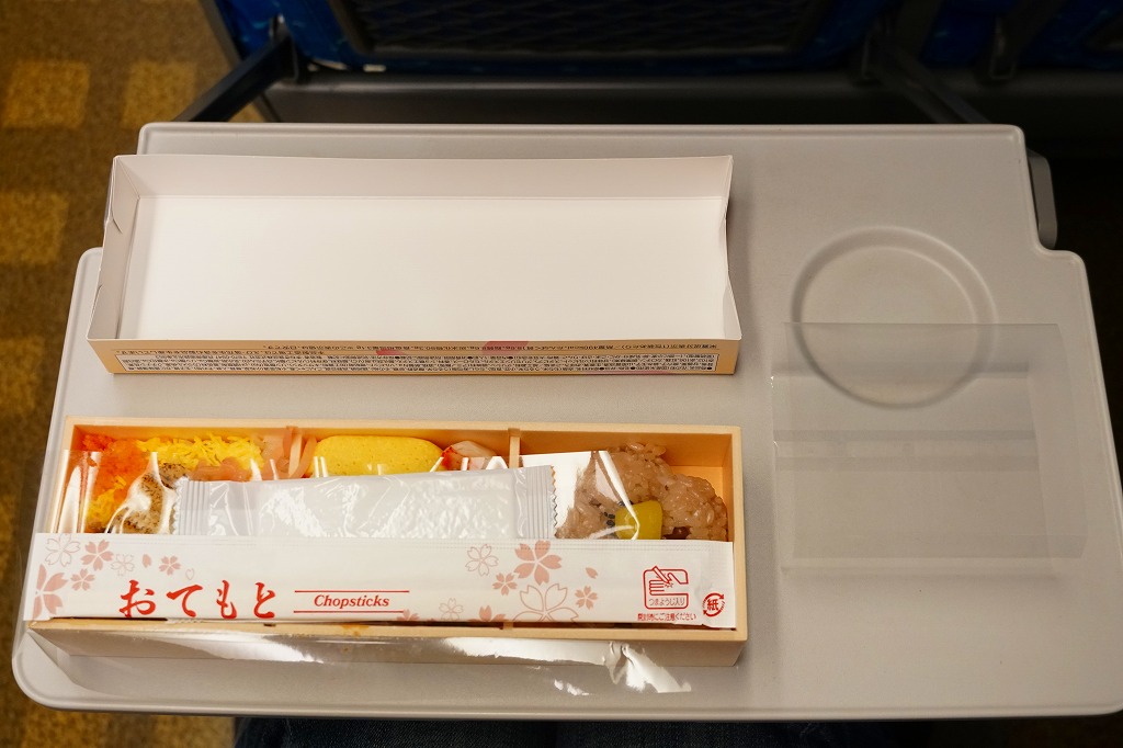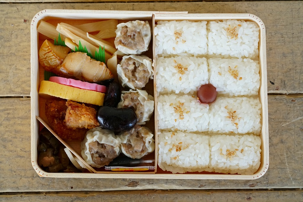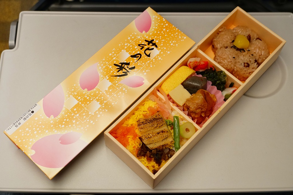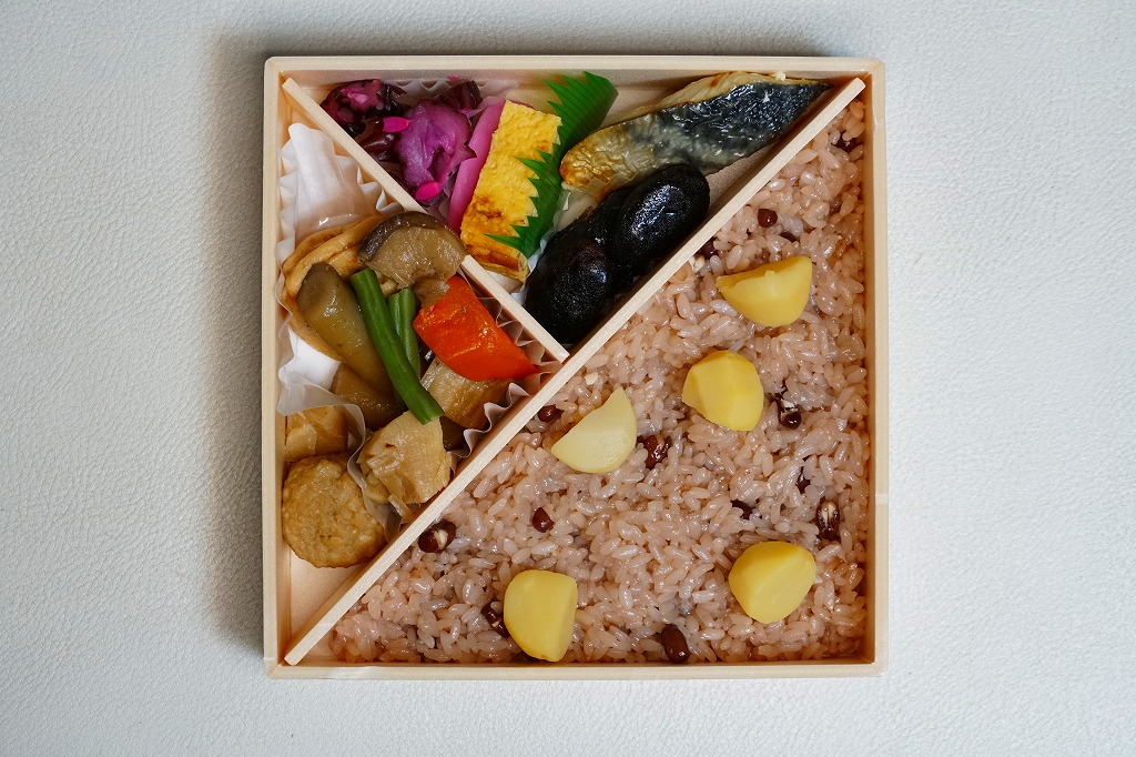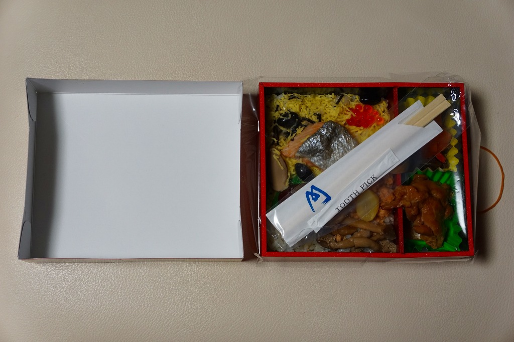 2010年代か、それ以前から存在していた商品か。もとは調製元の仕出し弁当店ブランド「味三昧」で取り扱われ、のちに駅弁売店で出てきたのではないかと思う。ふたに商品名を描いた細身の容器は、長方形3個分。その左右に栗を載せた花形の赤飯と、アナゴやシイタケなどのちらし寿司を据え、中央に鶏照焼、高野豆腐、こんにゃく煮、小松菜漬、玉子焼、かに風味蒲鉾などのおかずや付合せ。駅弁の発想では生まれないようにみえる、軽食以上の分量を持つ小箱。価格は2017年時点で600円、2023年時点で700円、2024年時点で780円、2025年時点で880円。
