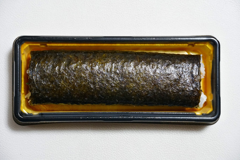 2022(令和4)年の節分の、2月3日に買えた姫路駅弁の恵方巻のひとつ。千葉駅へ輸送された商品を買うと、割りばしは千葉駅弁の万葉軒のものが付いてきた。酢飯と玉子焼とミツバと、カニの酢漬と味付ほぐし身とフレークを、海苔で巻いてプラ製の容器に置き、商品名を書いた掛紙で巻く。カニの風味や分量はあまりないかもしれない、行事どおり切り目のない、直接かぶりつけるサイズの太巻き。節分でなくても姫路駅ならば、優れた太巻き駅弁「大名巻」や棒寿司「名代あなご寿司」「名代松前寿司」が一年中買えると思う。
