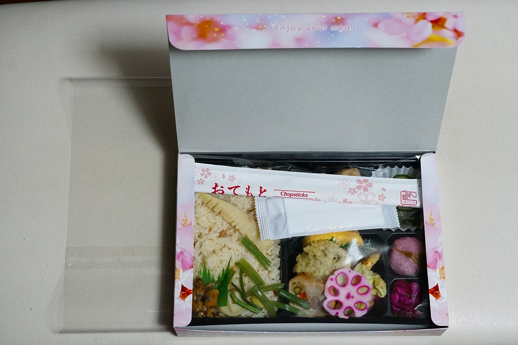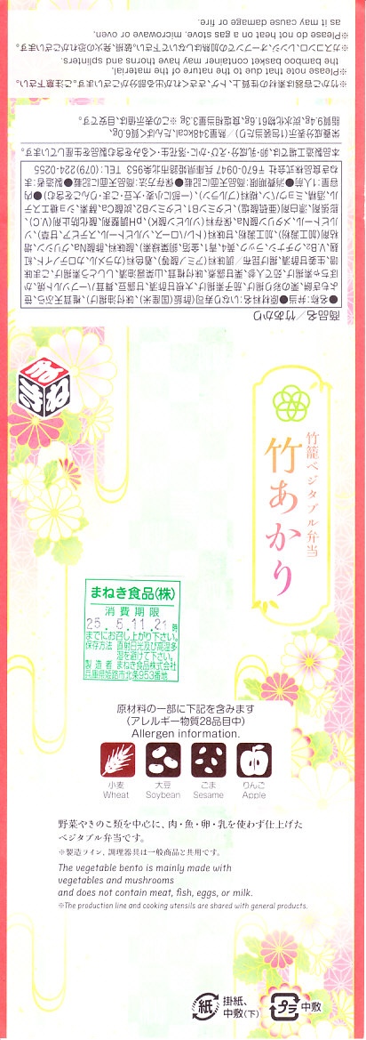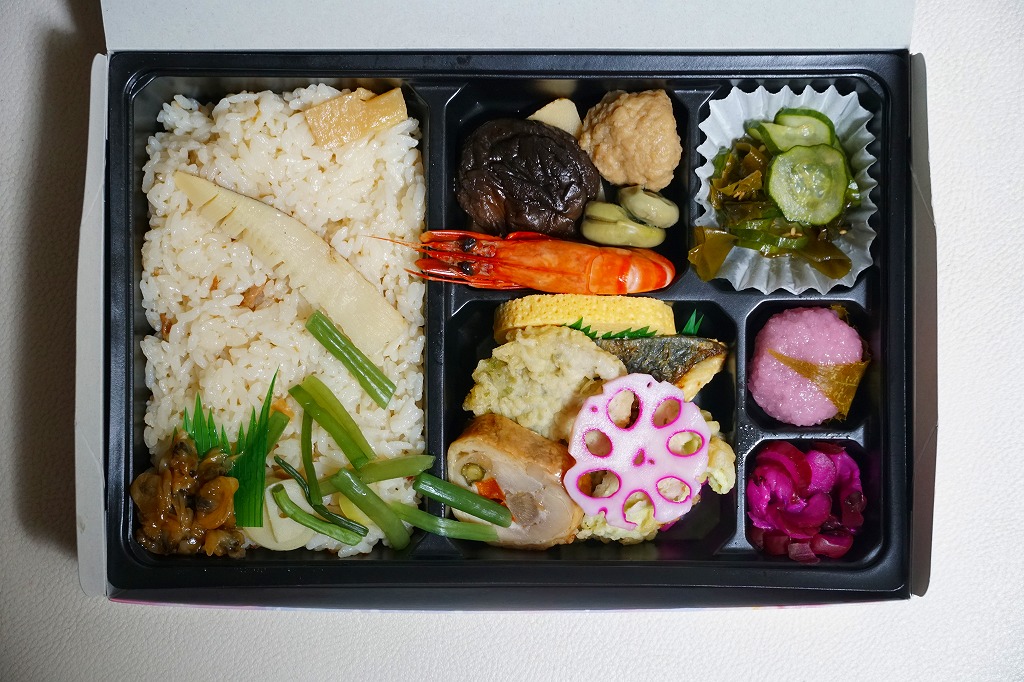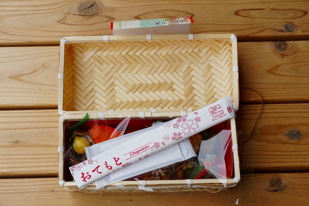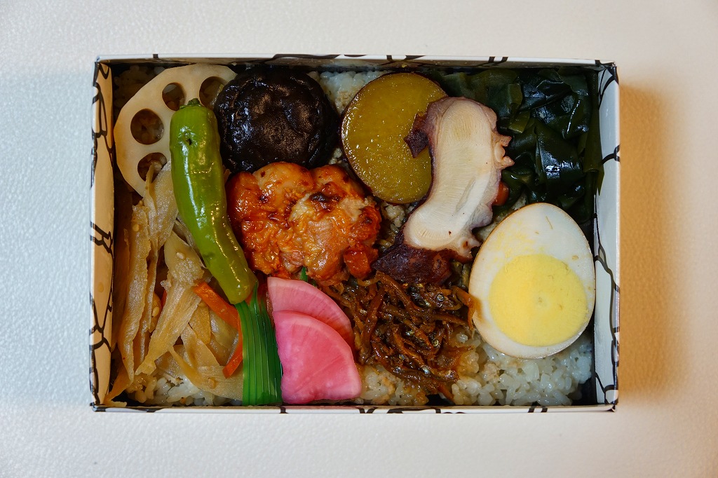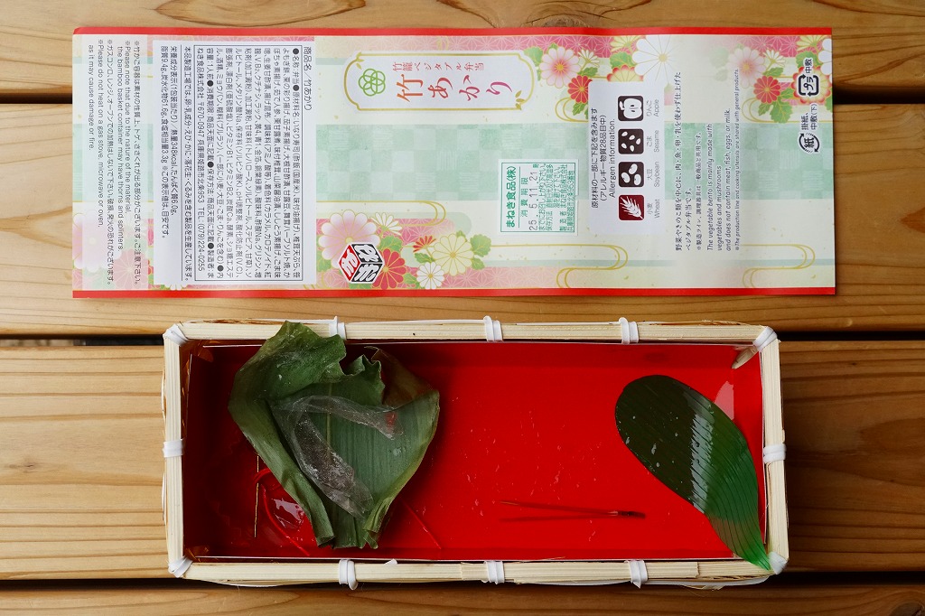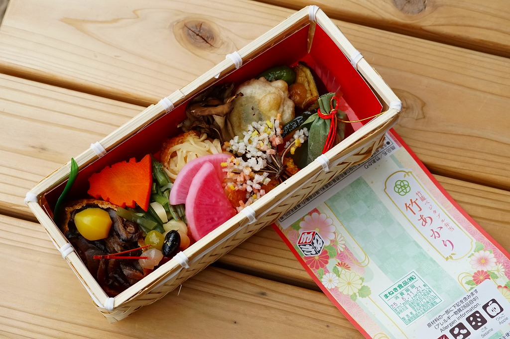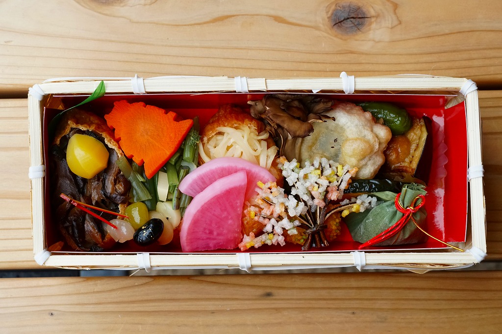 駅弁に使うには高級だと思う竹籠の商材に、商品名などを記して赤みがかった掛紙を巻く。野菜やきのこ類を中心に、肉・魚・卵・乳を使わずに仕上げたという中身は、甘酢生姜のいなりずし、山菜のいなりずし、栗としいたけのいなりずし、なすとかぼちゃとししとうの素揚げ、しいたけの天ぷら、甘酢大根、城型のにんじん、花木のような揚げ昆布、笹よもぎ餅などを折り重ねたもの。写真では華やかであり賑やかでも、実物を見たり食べれば落ち着きを感じた。