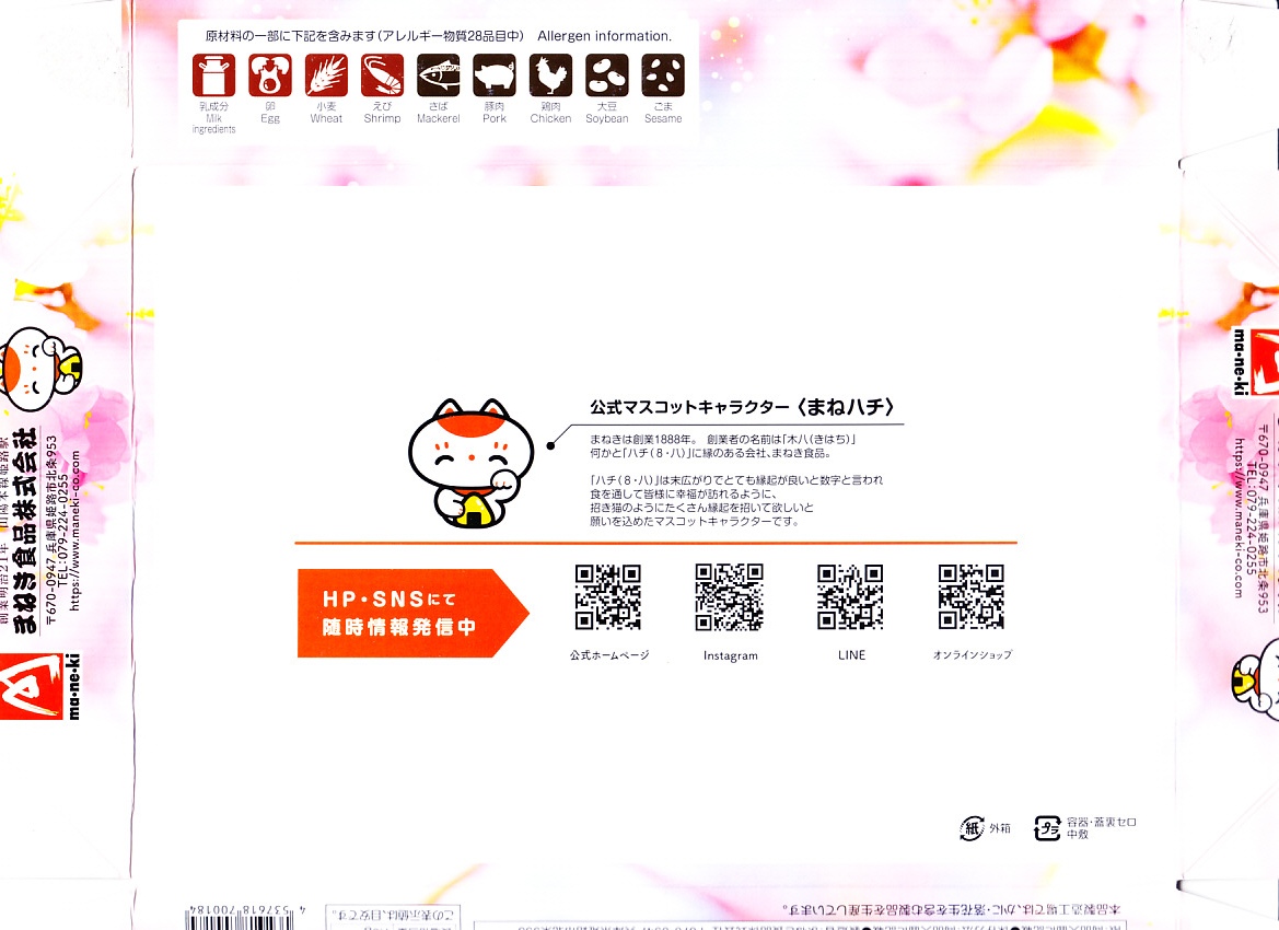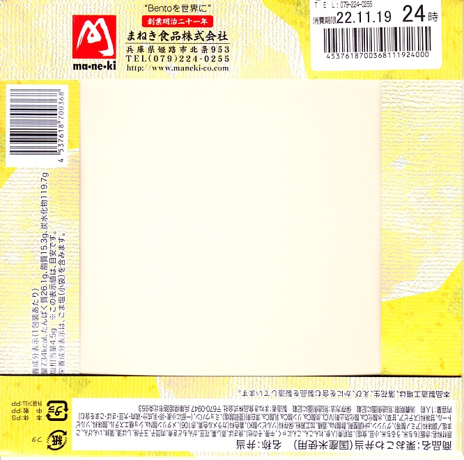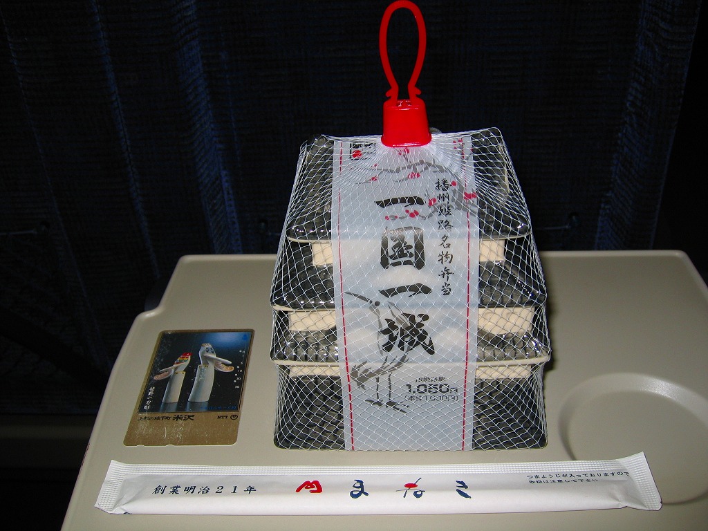 「駅弁図鑑西日本版」によると2016(平成28)年9月の新発売というが、もっと前から売られるものであり、内容からこれは昭和時代からの駅弁だろう。小さな折箱に、大名巻寿司というシイタケや玉子焼などの太巻きを4個、松前寿司という昆布巻のサバ寿司2個、瀬戸内鯛寿司というタイの押寿司2個と、酢れんこん2個を詰める。コウノトリと姫路城を描く掛紙の絵柄を含め、ずいぶんと古めかしい、汽車の時代を思わせるつくり。新幹線の駅と時代での健在に驚いた。2022年時点で駅弁図鑑や調製元の公式サイトから消えている。