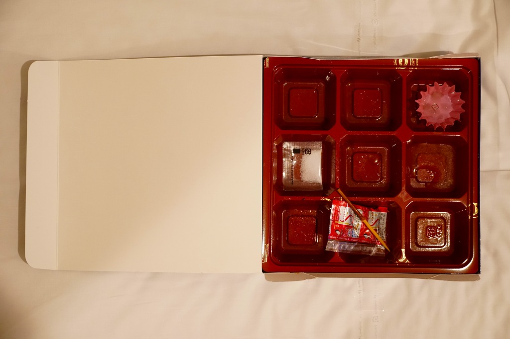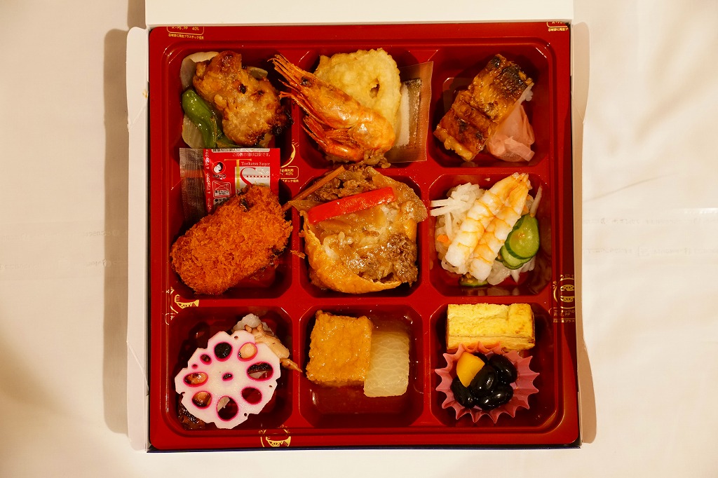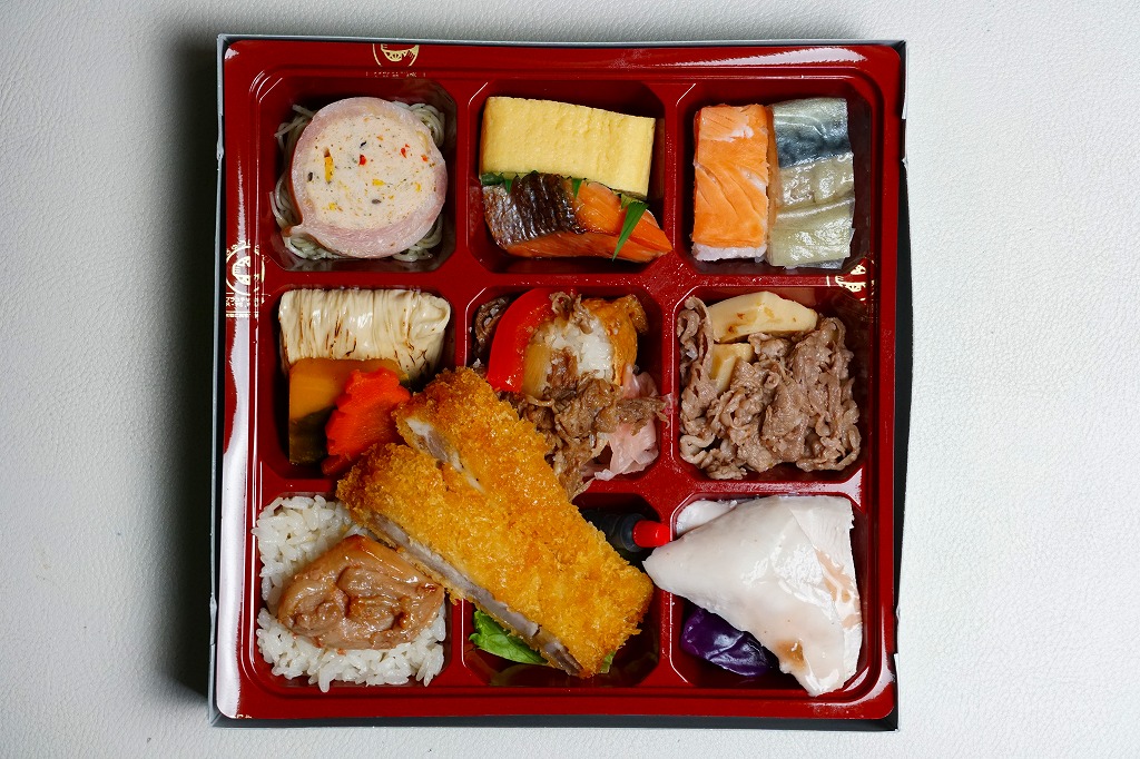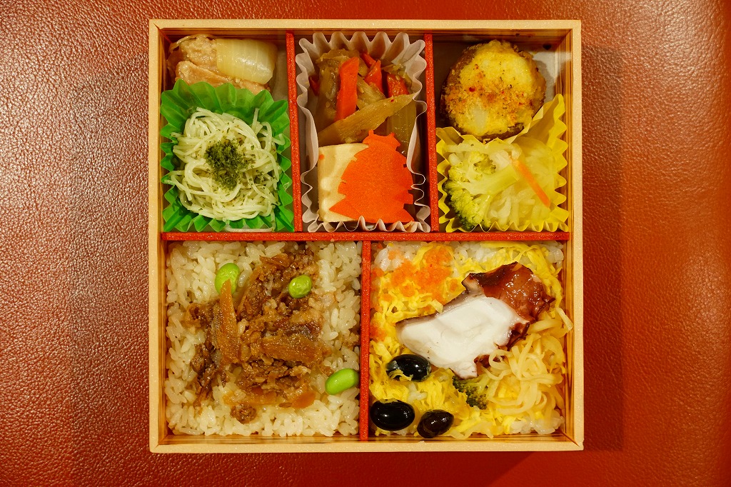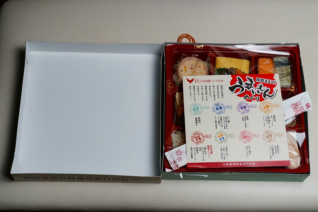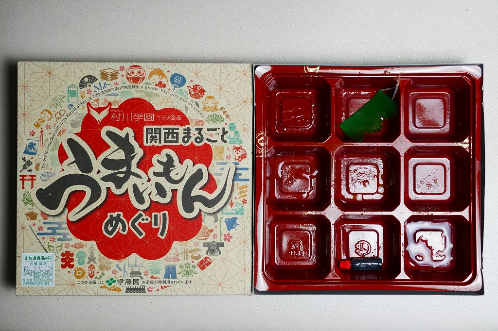 麻の葉文様に日本らしいアイコンが賑やかな専用の紙箱には、伊藤園の茶殻が再利用されていると書いてある。近畿2府4県の食材や食文化を取り入れた献立を詰め合わせたという中身は、大阪として押寿司と大阪豚ロースとんかつ、京都として煮物、兵庫としてだし飯と淡路どりのタレ焼きとだし巻き玉子、滋賀として銀鮭の幽庵焼き、奈良として煮物あんと三輪素麺のジェノベーゼ風、和歌山として蒸し鶏の梅タレがけ、そして大阪×兵庫として化粧いなり、村上学園として神戸牛のオイスターソース炒めと若鶏のガランティーヌと筍の土佐煮。これらを9区画に詰め合わせた、高額なお弁当。