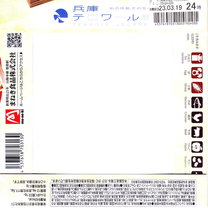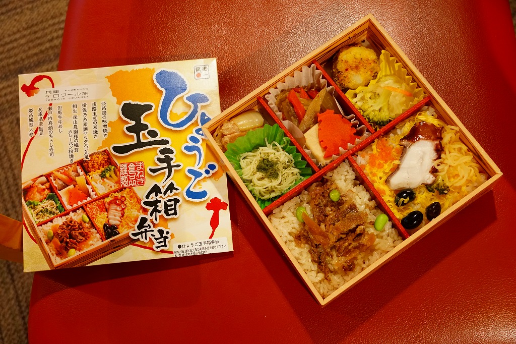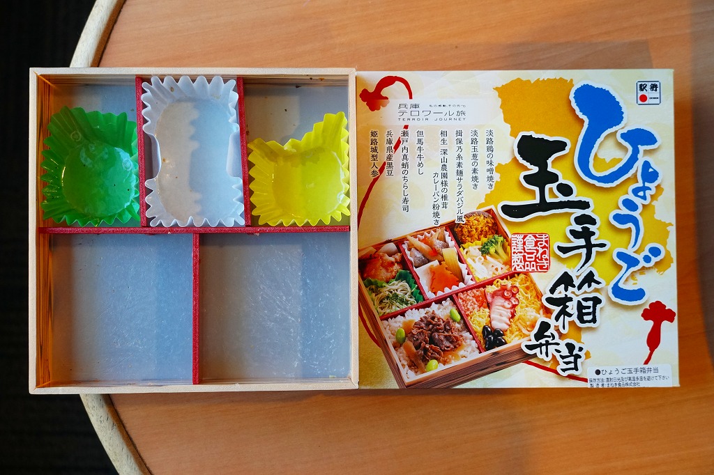 ふたには兵庫県土のシルエットと商品名、中身の写真とおしながき、観光キャンペーンのキャッチフレーズ「兵庫テロワール旅」の表記がある。中身は但馬牛牛めし、瀬戸内真蛸のちらし寿司、相生深山農園様の椎茸カレーパン粉焼き、揖保乃糸素麺サラダバジル風、淡路鶏の味噌焼き、淡路玉葱の素焼き、姫路城型人参など。これは今の兵庫県のうち主に瀬戸内海エリアで親しまれたり売り出し中の味覚を、かなり貪欲に詰めた玉手箱。