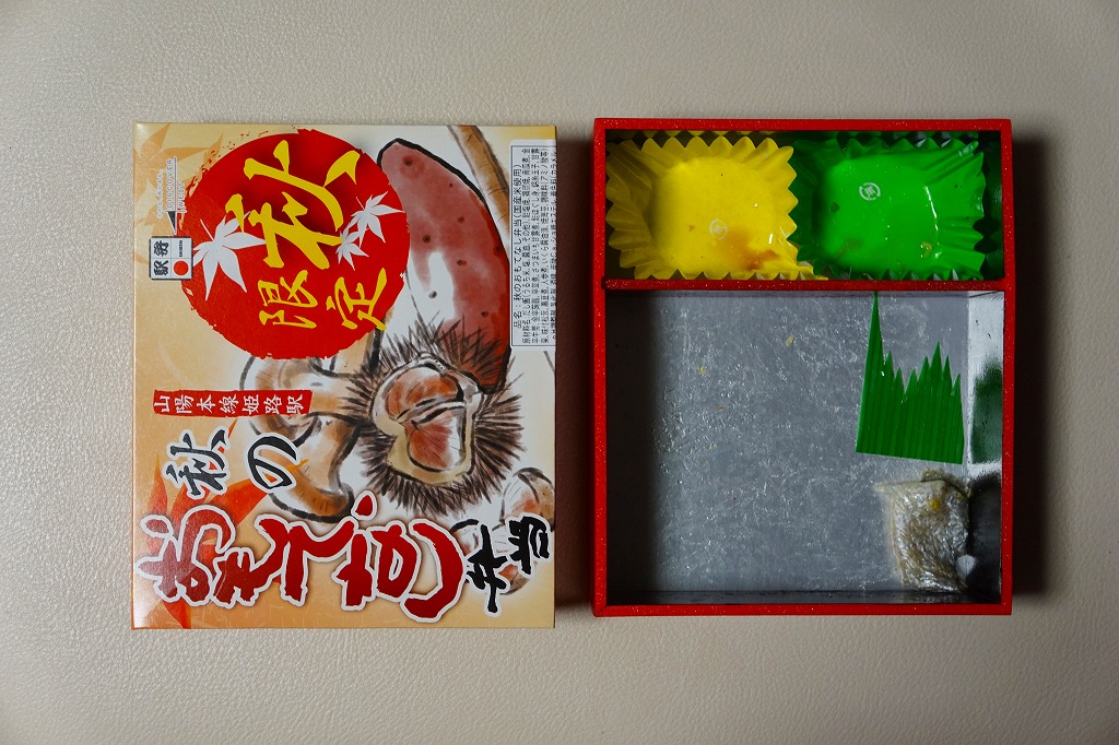 調製元と商品名から、姫路駅の秋駅弁と推測。しかし公式にも非公式にも、東京駅とスーパーの駅弁催事にしか情報がなく、姫路で売らない疑義駅弁の可能性がある。白御飯を錦糸卵で覆い、焼き鮭、鮭フレーク、クリ、シメジ、イクラ、サツマイモ、マツタケなどを散らし、鶏照焼ときんぴらを添え、クリとイモとキノコを描いたふたをかける。悪いところはないが、構造も見た目も味も内容も、まるで日本レストランエンタプライズ(NRE)の東京駅弁。ここに姫路も関西も西日本も何もなく、東京駅で売っても姫路やその駅弁を思い起こすことはないだろう。「おかめ弁当」でも持ってこればいいのにと思う。2016年秋のみの販売か。2017年からは「秋の姫路城弁当」が売られる。