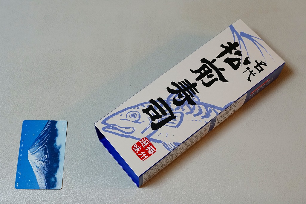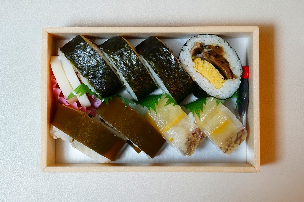 だいぶ古くからあるのではないかと思う駅弁。酢飯にシメサバを合わせて黒板昆布で巻く棒寿司が1本、9切れにカットされてフィルムに包まれ、紙箱に収まる。松前寿司とは、昆布巻の棒寿司、あるいは北海道産の昆布で巻いた鯖寿司に対する総称で、現在の北海道松前地方から大阪へ船で運ばれた昆布を使ったことにちなむ。サバ寿司の昆布巻きは他の駅の駅弁にもあるが、これを松前寿司と名乗り売る駅弁屋は、ここだけではないかと思う。密封される土産物と違い、列車内でも食べやすい。価格は2010年時点で1,300円、2014年時点で1,350円、2024年時点で1,500円、2025年時点で1,580円。