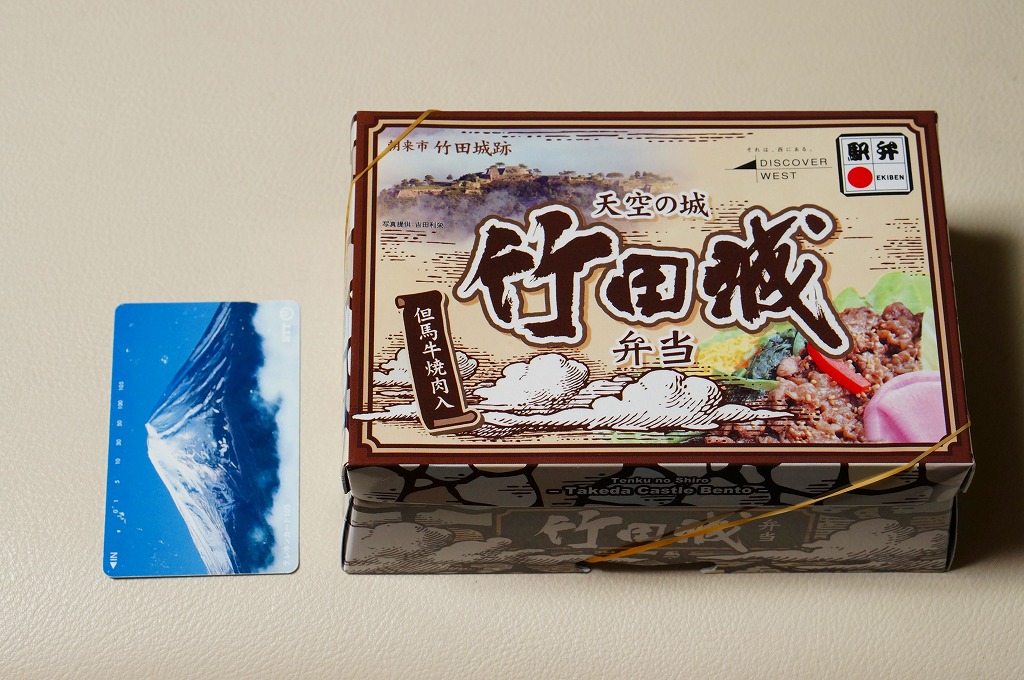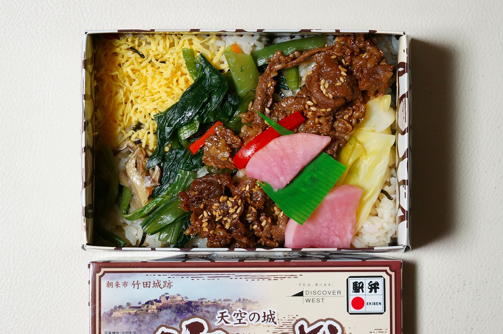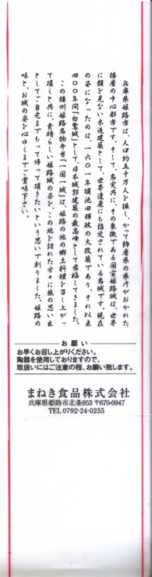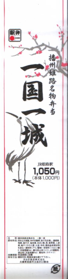 2014(平成26)年の6月までに発売か。城の石垣を絵柄と形状で再現した感じのボール紙製容器に、姫路駅名物「えきそば」で使うだし汁で炊いた御飯を直に詰め、錦糸卵、小松菜漬、但馬牛の焼肉、キャベツ煮浸しのストライプで覆い、シイタケ煮とダイコン漬を添える。駅弁大会での購入がたたったのか、普段からこうなのか、メインの但馬牛焼肉は少なく、脂も固さもブランド牛のそれではなかった。1年間ほどの販売か。2018〜2019年の駅弁大会シーズンにもデパートやスーパーで販売された模様。