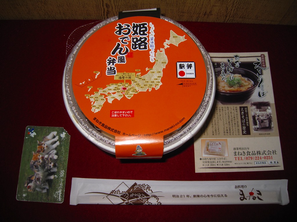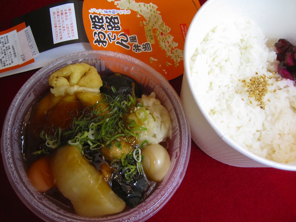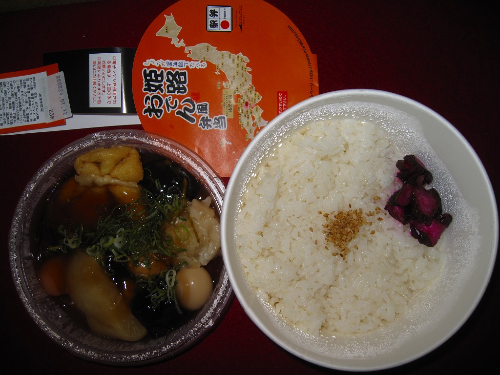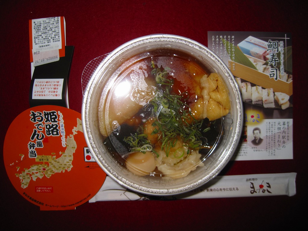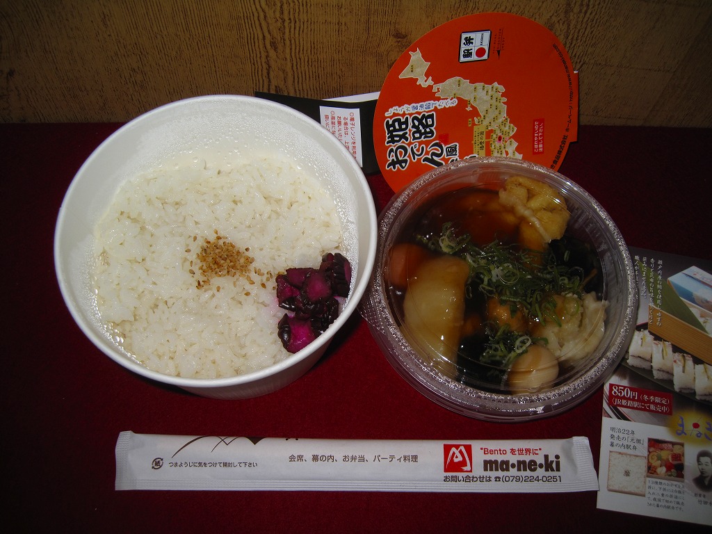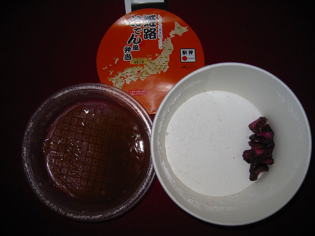 駅弁向けにあんかけにしたというおでんの汁は、姫路おでんの特徴とされる生姜の風味はどこへやら、まるで塩辛で、単独で飯や酒のお供になりそうなくらいだった。駅弁大会史上初のおでん駅弁という週刊誌の考察があるようだが、2010年1月に同じ調製元が阪神百貨店の駅弁大会で売った「トライスバーガー弁当」もそうなのでは。あれはやはり催事専用の疑義駅弁だったということか。