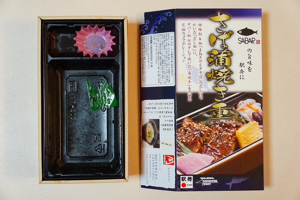 2017(平成29)年1月の発売か。パッケージの記載事項から、姫路駅の駅弁屋と、大阪府豊中のサバ業者が共同開発した駅弁だと想像する。姫路駅の名物「えきそば」のだし汁で炊いた御飯に、秘伝のタレで焼いたというサバの蒲焼きを置き、刻み海苔、わかめ、玉子焼、甘酢大根で囲い、大根なますと煮豆を添える。