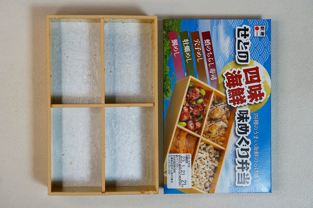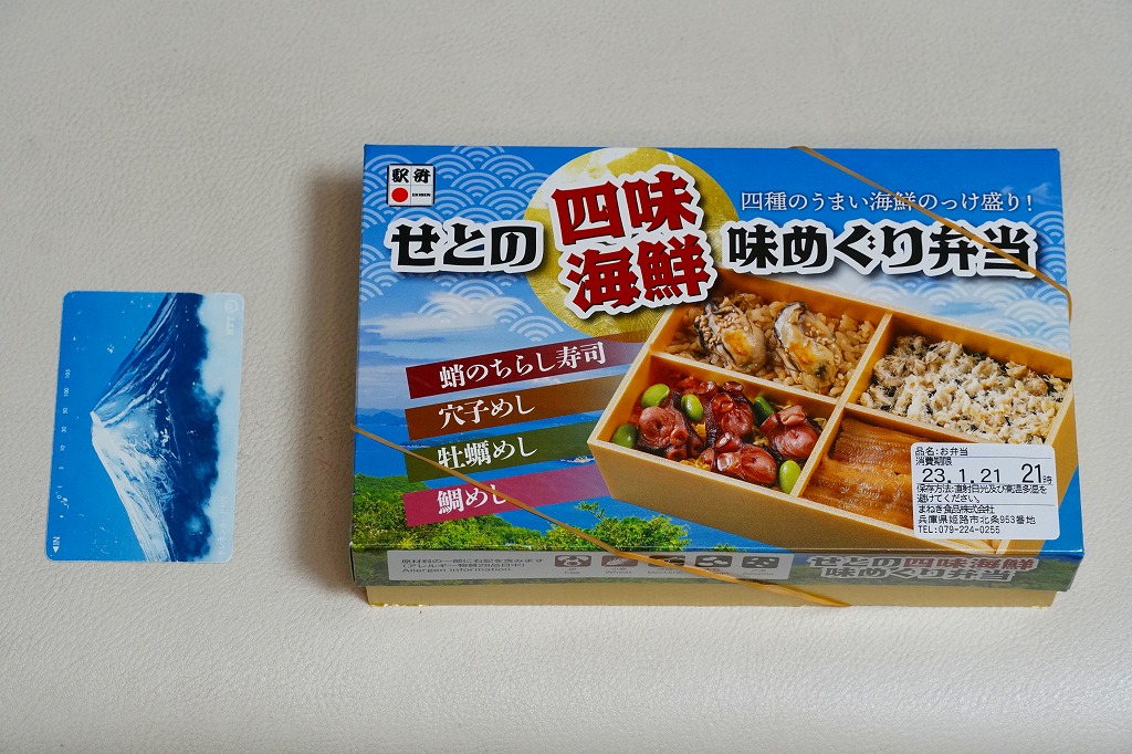 秋冬の駅弁大会シーズンに向けた、2022(令和4)年秋の新商品か。過去にも姫路駅弁の実演販売などで使われた、4区画の長方形容器に、蛸(たこ)のちらし寿司、穴子めし、牡蠣(かき)めし、鯛めしを詰める。これらの内容はすべて既存の姫路駅弁で、それぞれおいしかった記憶があり、これは便利でうまい姫路駅弁一覧。おかずも漬物も調味料も何も添付しない潔さは、催事向けだからかどうか。翌2023年シーズンまでの販売か。