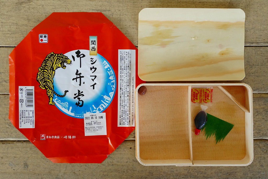 掛紙の絵柄はシウマイ弁当に準じ、龍が虎になり、水晶玉のシルエットが姫路城その他京阪神エリアの名所となった。経木折はシウマイ弁当と同じものと思われ、これに横浜版よりやや小さなふたをして輪ゴムでしばり、掛紙をかけて太めのひもで十字にしばる。中身は白ごまの日の丸俵飯、関西シウマイ5個、拍子木切りの細長い筍煮、サバ幽庵焼、あご出汁の鶏唐揚、かまぼこと出し巻玉子、花豆煮、酢れんこん、しば漬、からし袋、魚型の醤油入れ。そんな構成も、横浜駅弁にそっくり。ただし、味付けや色合いは淡め。塩や醤油が薄く、出汁の味が利いている。