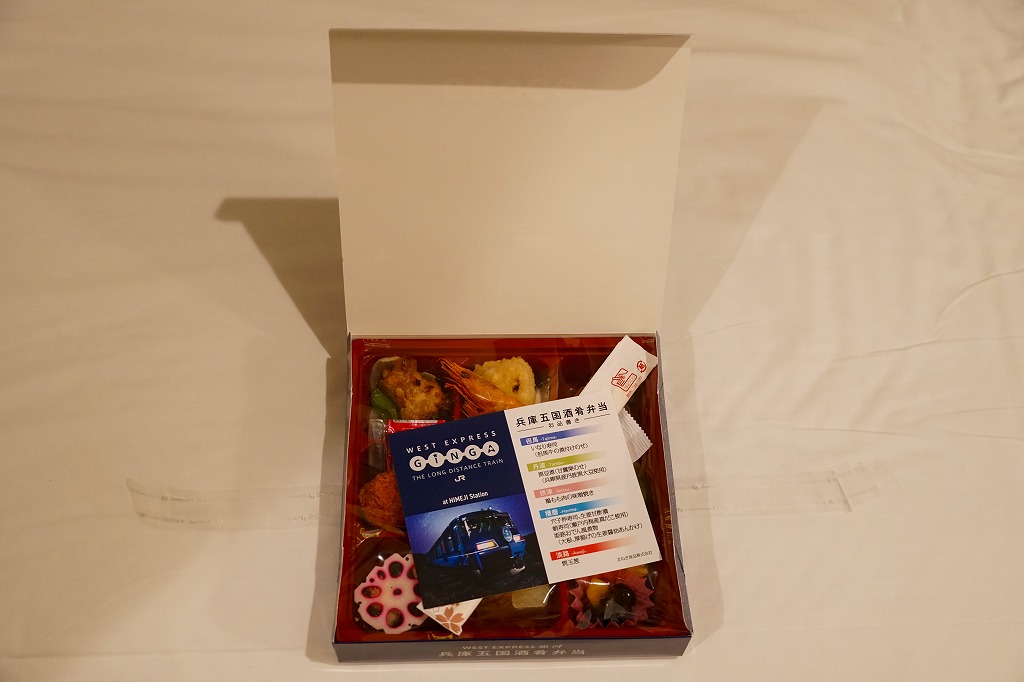 2020(令和2)年9月11日に姫路駅で発売。駅弁の名前は「兵庫五国酒肴(しゅこう)弁当」とも。専用のボール紙箱には、同日に営業運転を開始したJR西日本の団体専用列車「WEST EXPRESS 銀河」(ウエストエクスプレスぎんが)の美しい画像を掲載し、添付のおしながきにも使われる。日中の販売に加え、この列車が金曜深夜に姫路駅へ来た場合はそのホーム上でも販売する。