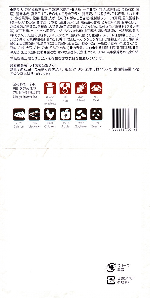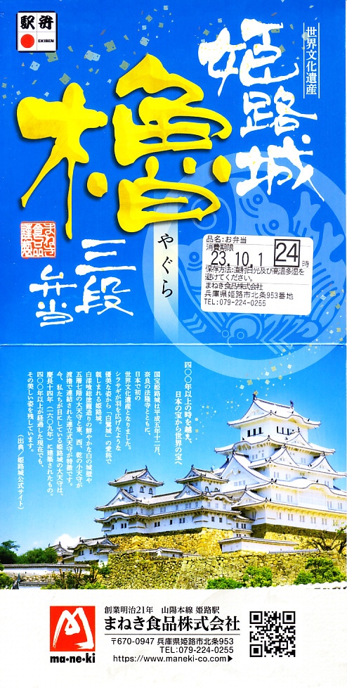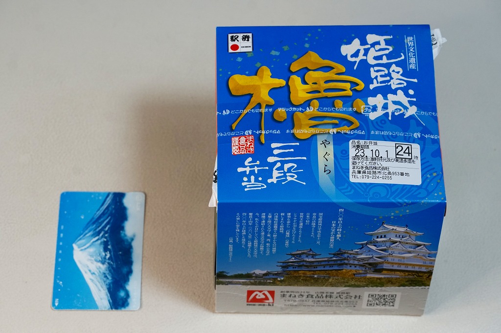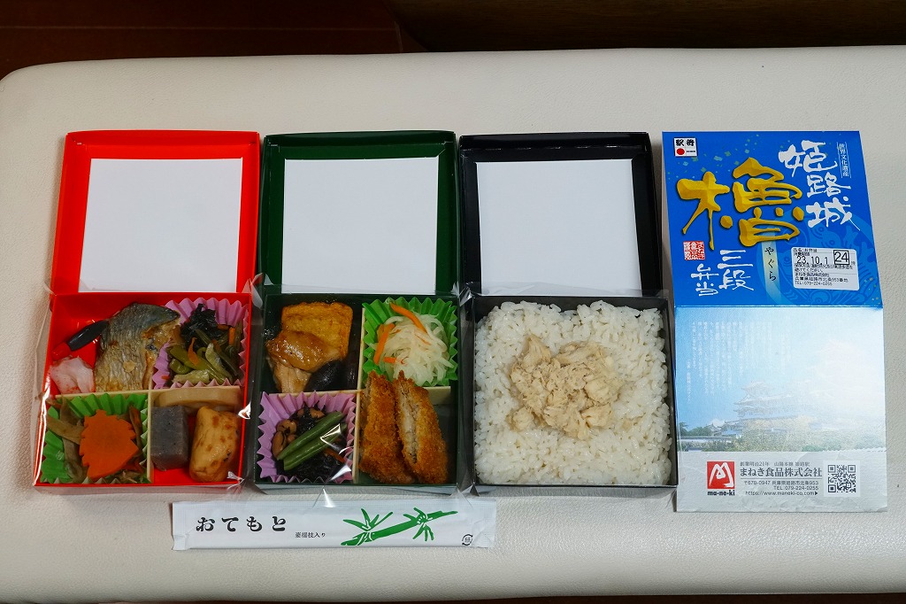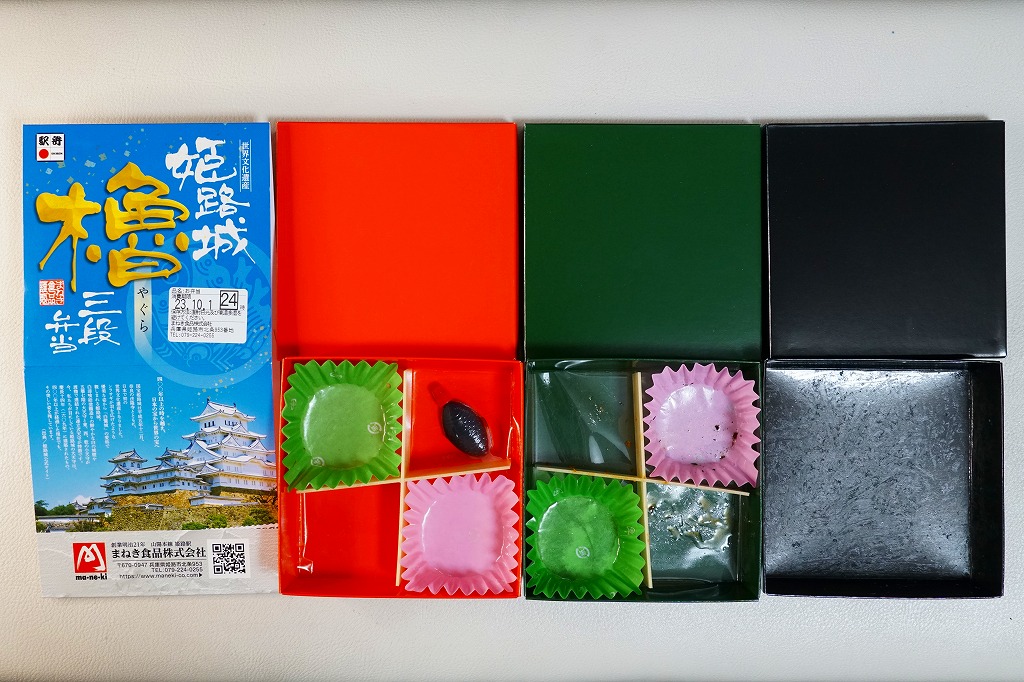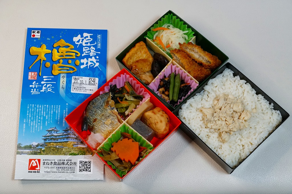 秋冬の駅弁大会シーズンに向けた、2022(令和4)年秋の新商品か。翌2023年10月に改めて新商品として出てきて、JR東日本の駅弁キャンペーン「駅弁味の陣2023」にエントリー。昭和60年代に「博多三色弁当」など各地で駅弁の容器として使われ、2017年にJR30周年で復刻販売された当時の姫路駅弁「櫓弁当」でも使われた、赤と緑と黒の紙箱を重ねた容器を収めるスリーブには、もちろん今の姫路城の写真と、その紹介文や商品名が描かれる。姫路城世界文化遺産30周年で三段にしたのかどうか。