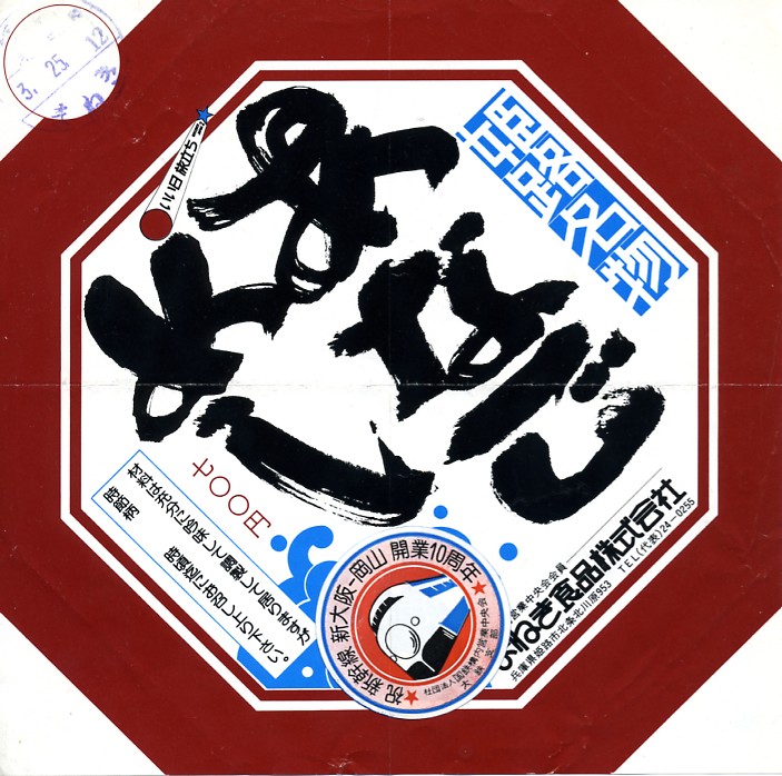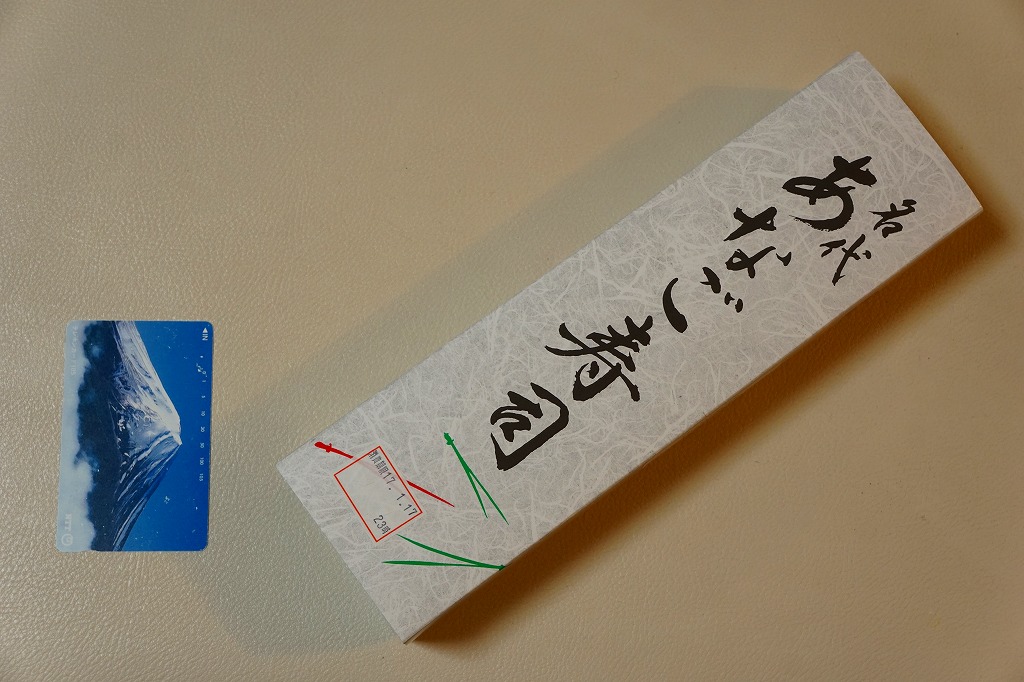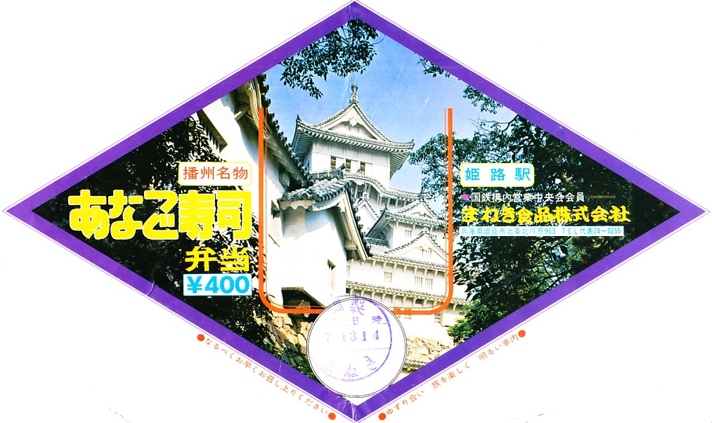 1982(昭和57)年3月25日12時の調製と思われる、昔の姫路駅弁の掛紙。調製印に製造年がないが、1972(昭和47)年に開業した新幹線新大阪・岡山間の開業10周年のシールが貼られており、これで判断。姫路のアナゴ駅弁は、めしより寿司が優勢だと思う。