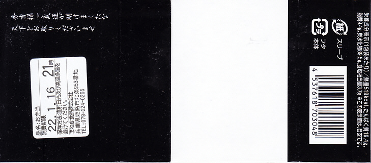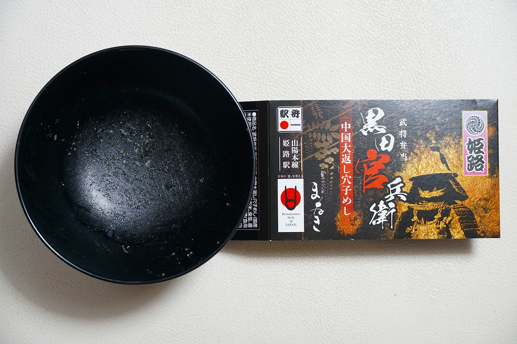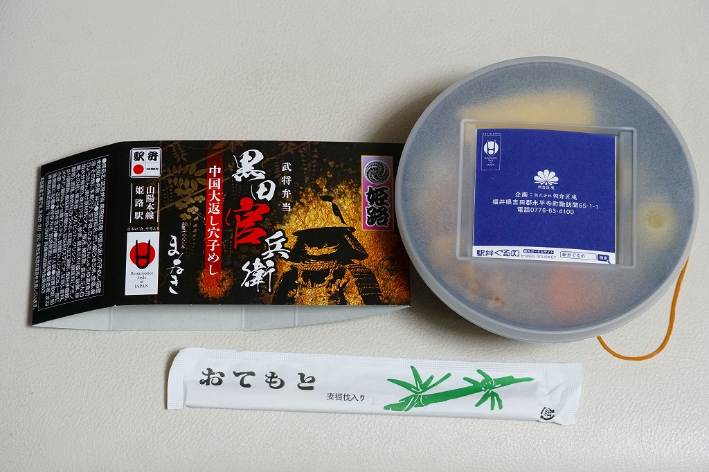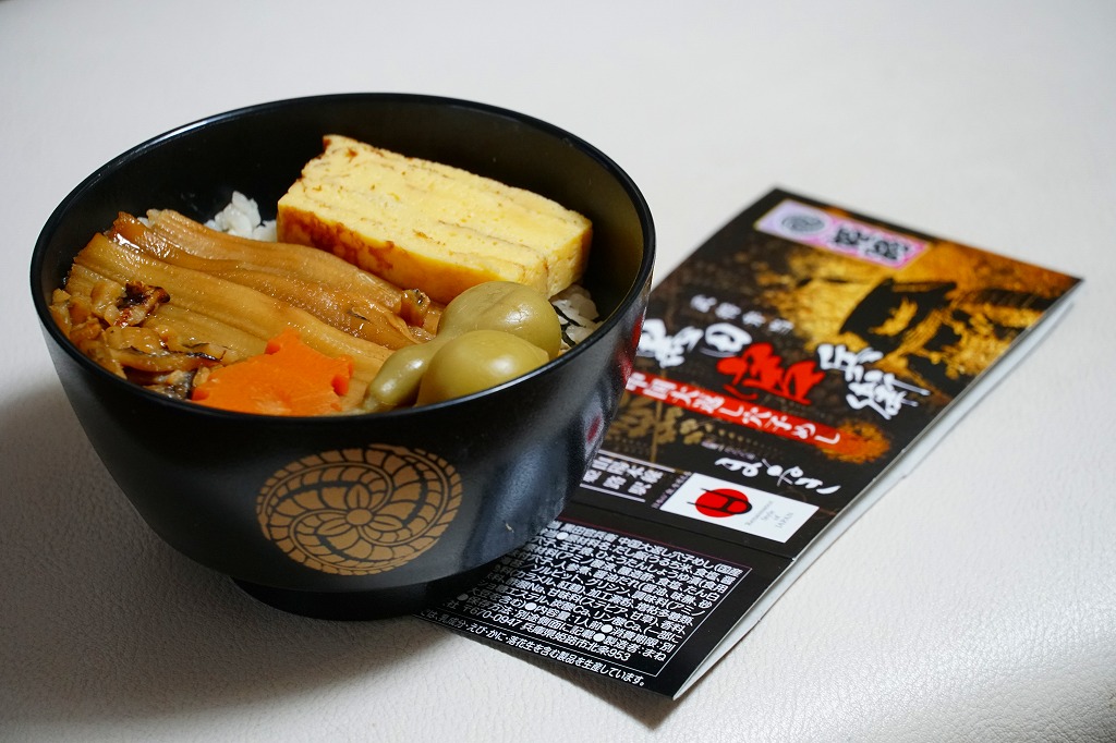 今回は黒いプラ容器が円錐状とボウル状で2種類あり、この黒田官兵衛はボウル状のもの。これに黒田家の家紋を入れ、日本古窯弁当と同じ半透明のふたをして、今回のシリーズで共通のしおりを置き、それらしき絵柄のスリーブで留める。中身は白飯を煮アナゴとその刻み、ひょうたん、玉子焼、刻み海苔、城型にんじんで覆うもの。味は定評のある姫路駅弁のアナゴと同じく、煮アナゴの柔らかさに焼アナゴの香りを付けたようなうまさ。黒田官兵衛の中国大返しをイメージしたお弁当なのだという。丸一日の日持ちがする弁当としてはよいと思う。