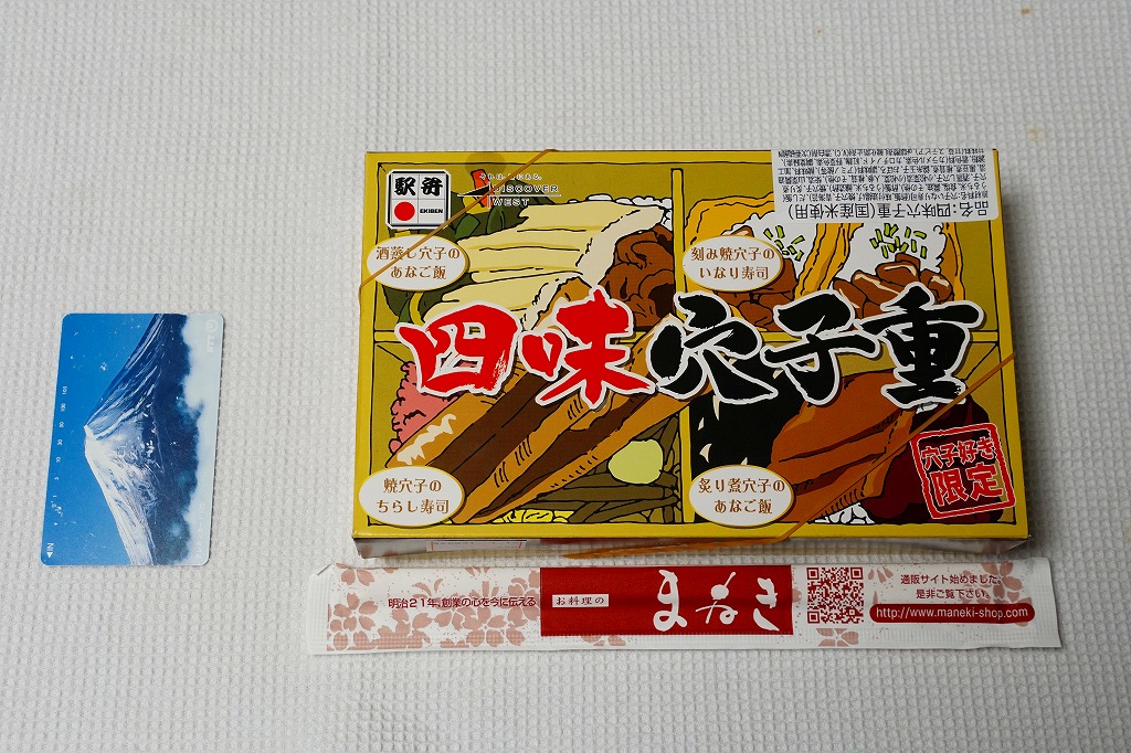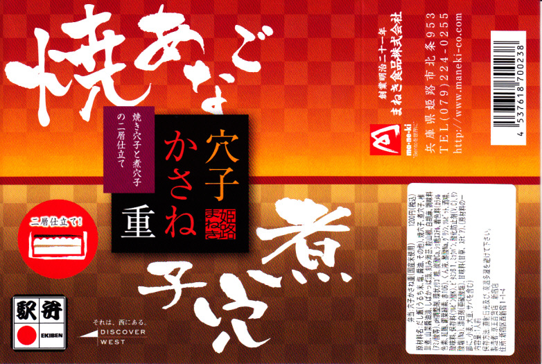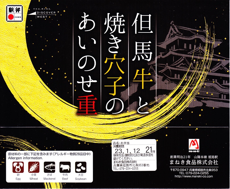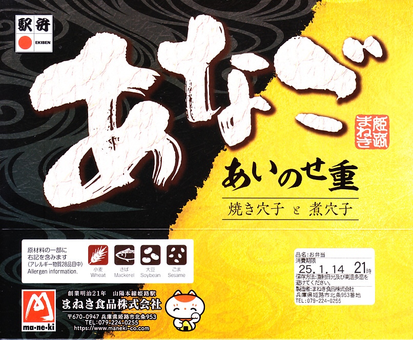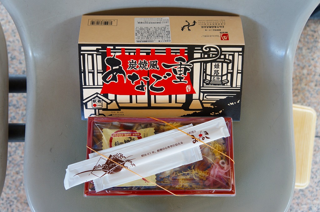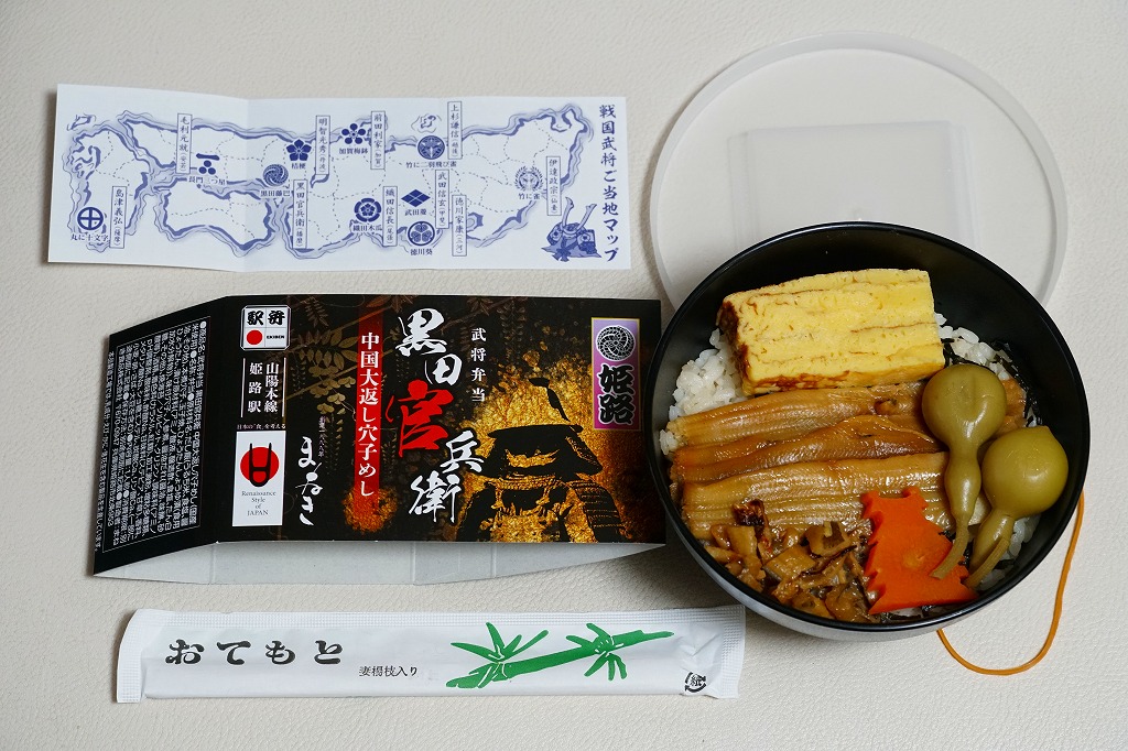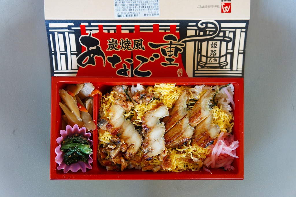 各地の駅弁でおなじみの発泡材枠な長方形の容器に、白御飯を詰めて刻み海苔を振り錦糸卵をまぶし、その上に焼きアナゴを並べて刻みアナゴも添えて紅ショウガを置き、菜の花ゴマ和えときんぴらごぼうを付け合わせる。東京での、駅弁売店の中の小さな実演販売ブースでの調製は制約がとても大きかったのだろう、焼きアナゴはアッサリし過ぎて、分量も非常に物足りなく、それでいてこの価格。姫路駅のアナゴ駅弁はこんなものではない。以後もどうも東京駅限定の姫路駅弁として売られる模様。価格は発売時や購入時で1,100円、2020年時点で1,180円。2022年度までの販売か。