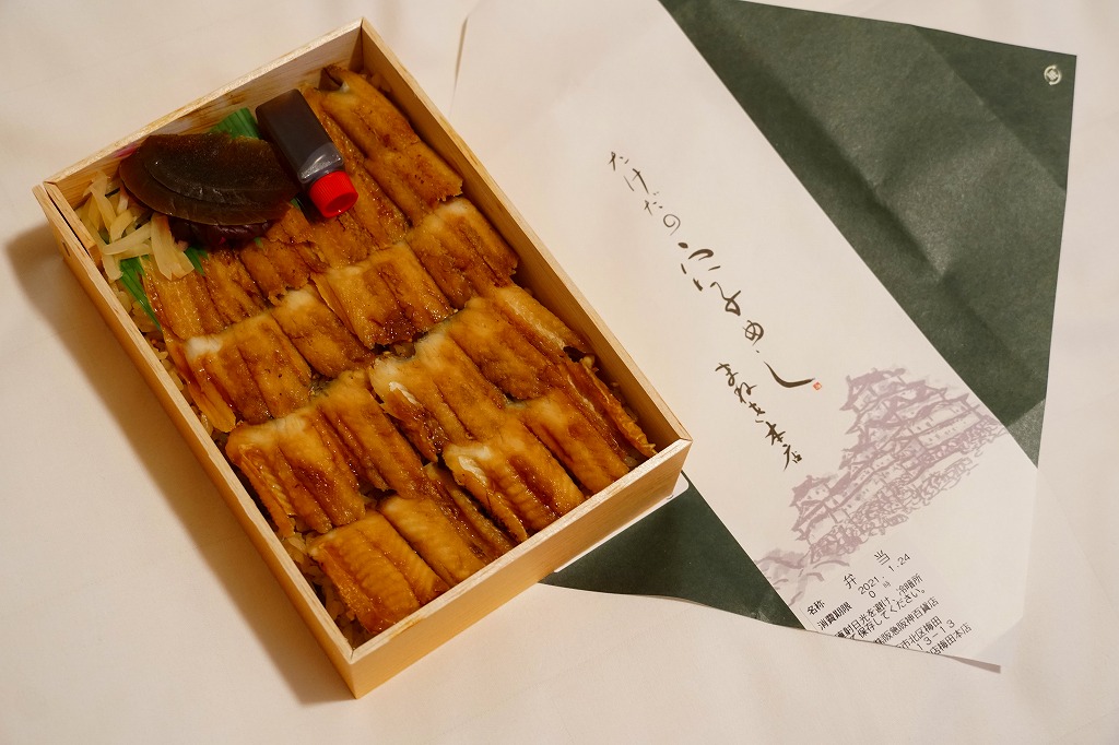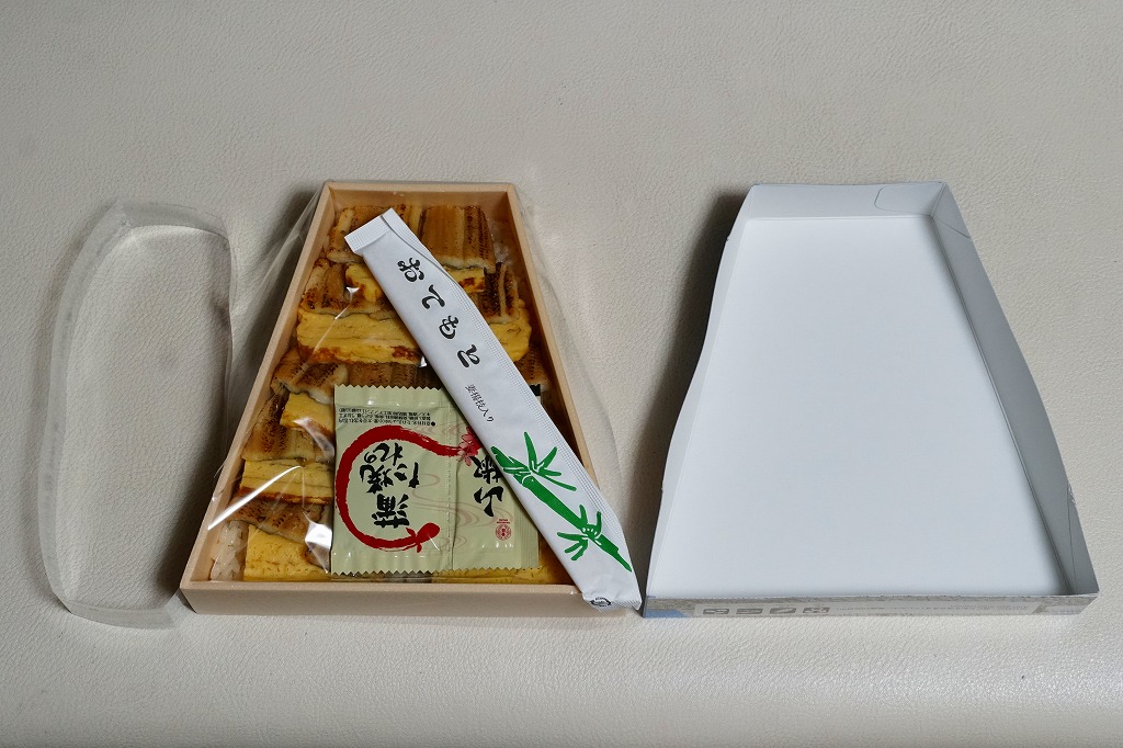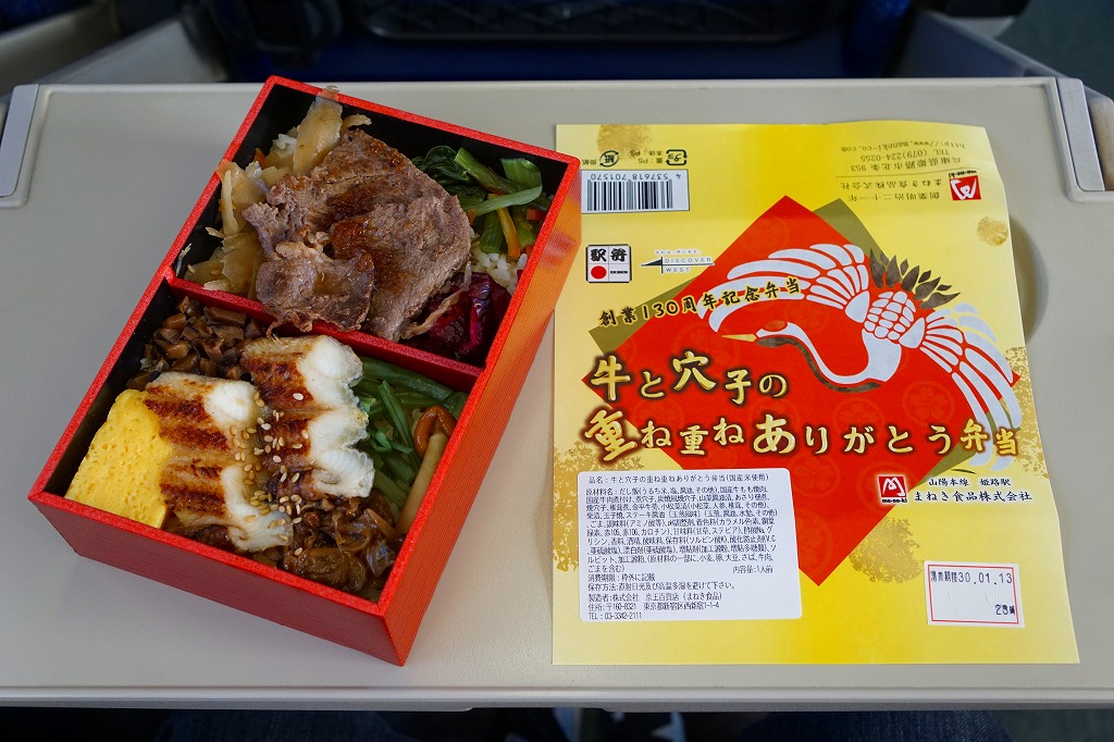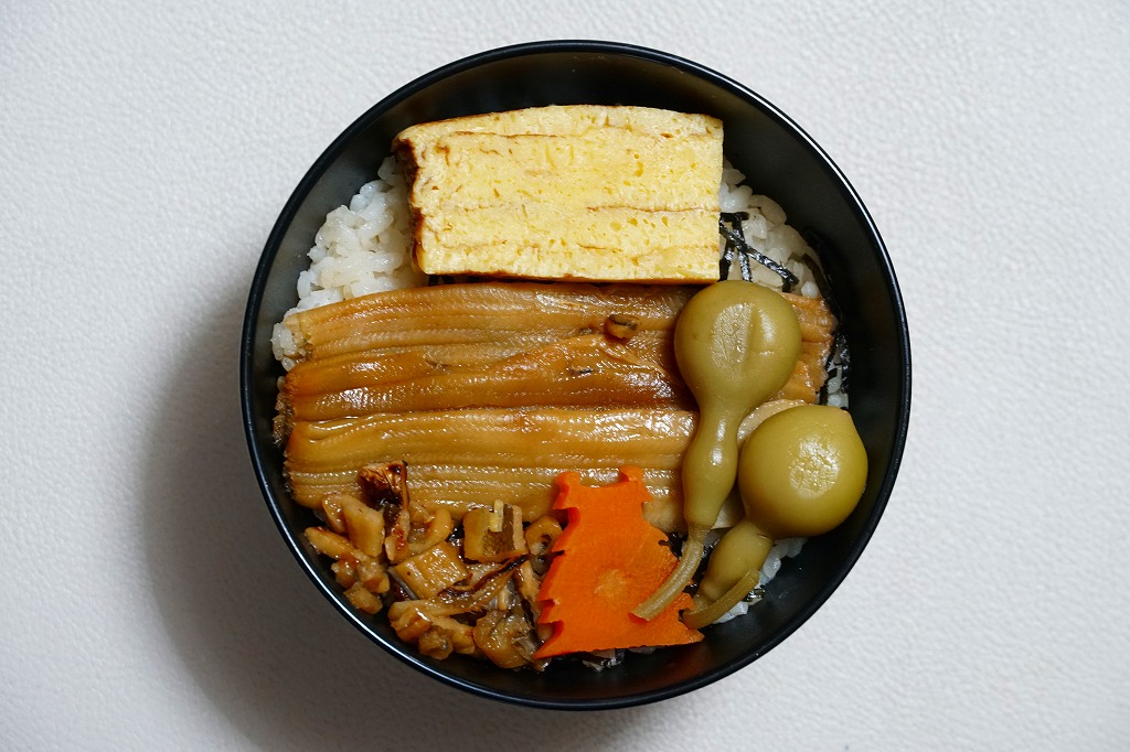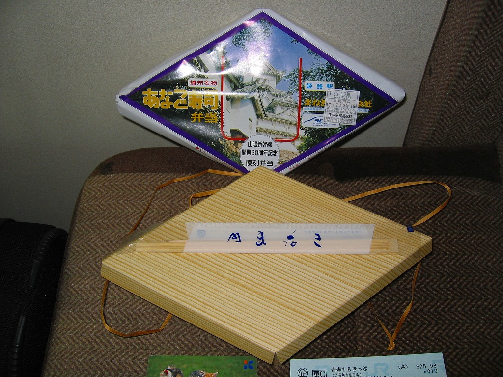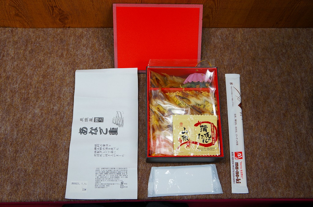 各地の駅弁でおなじみの発泡材枠な長方形の容器に、白御飯を詰めて刻み海苔を振り錦糸卵をまぶし、その上に焼きアナゴを並べて刻みアナゴも添えて紅ショウガを置き、菜の花ゴマ和えときんぴらごぼうを付け合わせる。東京での、駅弁売店の中の小さな実演販売ブースでの調製は制約がとても大きかったのだろう、焼きアナゴはアッサリし過ぎて、分量も非常に物足りなく、それでいてこの価格。姫路駅のアナゴ駅弁はこんなものではない。以後もどうも東京駅限定の姫路駅弁として売られる模様。価格は発売時や購入時で1,100円、2020年時点で1,180円。2022年度までの販売か。