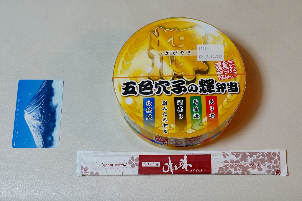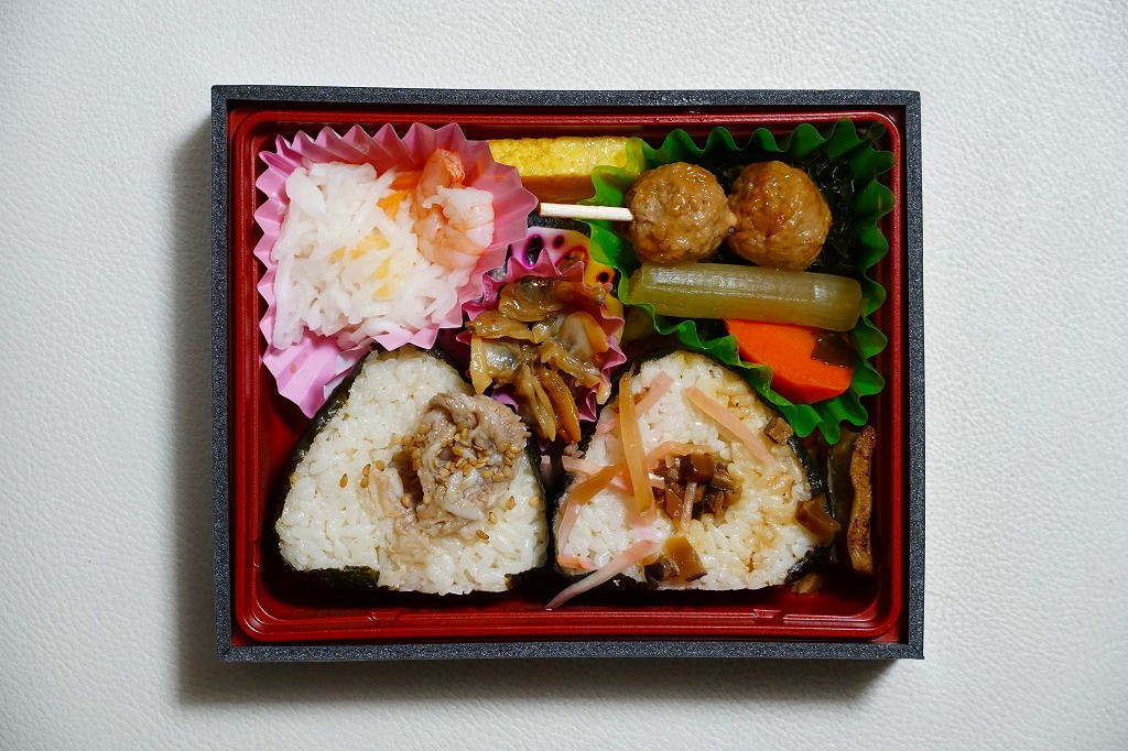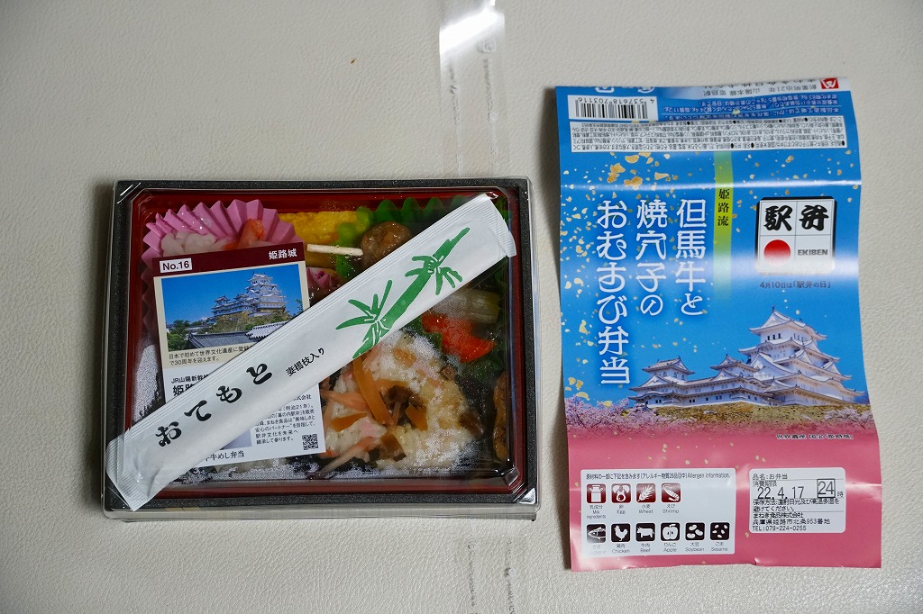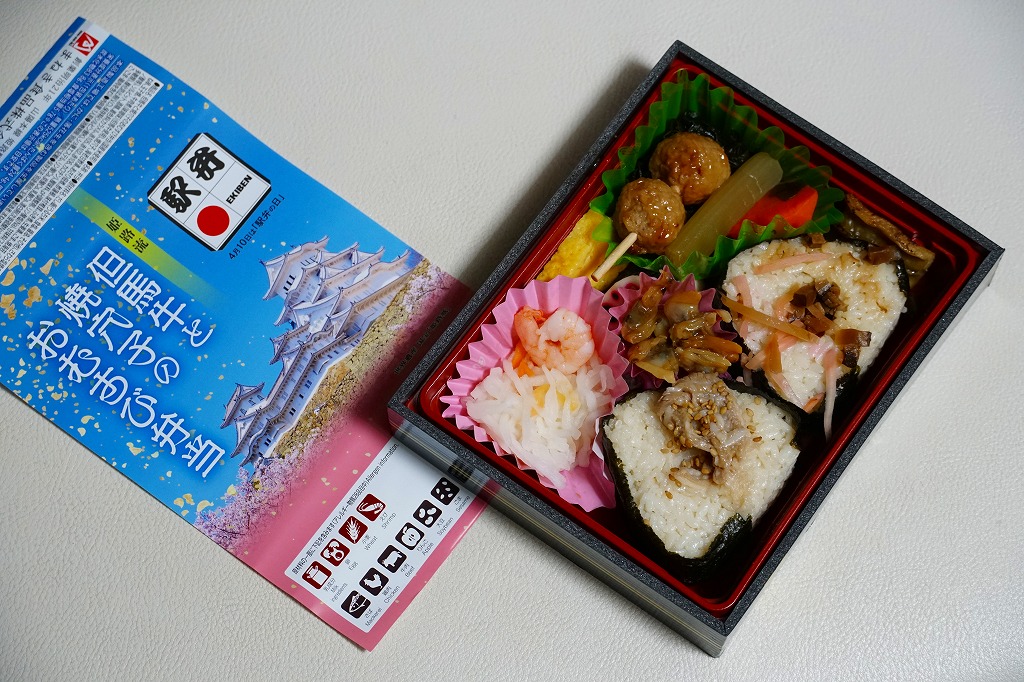 浅く平たいプラ容器に、白い姫路城が青空にまぶしい絵柄の掛紙を巻く。中身は三角柱の側部を海苔で巻いた、但馬牛煮と、焼穴子でなくシイタケ煮のおむすびが各1個に、つくね団子、ふきとニンジンの煮物、玉子焼、あさり佃煮、紅白なます、焼サワラ、焼アナゴなど。おにぎり、おむすびの記念駅弁なのに、その主役だけが情けない姿をしていて、おにぎり弁当らしからぬ充実したおかずでカバー。日本鉄道構内営業中央会の見本写真では、焼穴子おにぎりや倍量の牛肉が載るおにぎりの見栄えがしており、発売1週間で減量したか、これは輸送販売バージョンなのか。