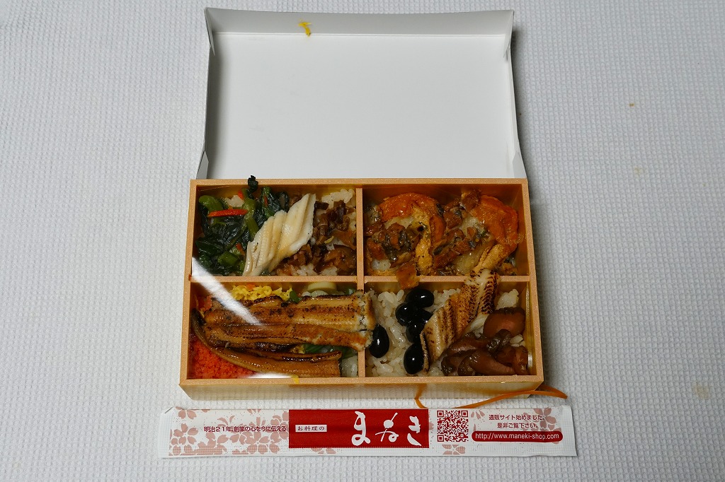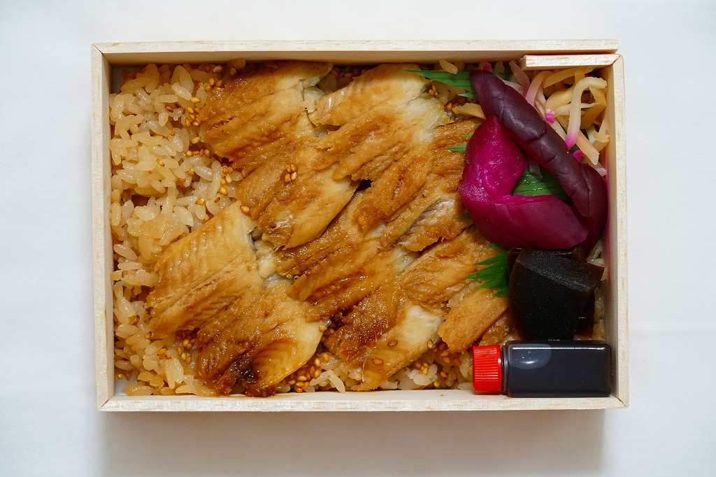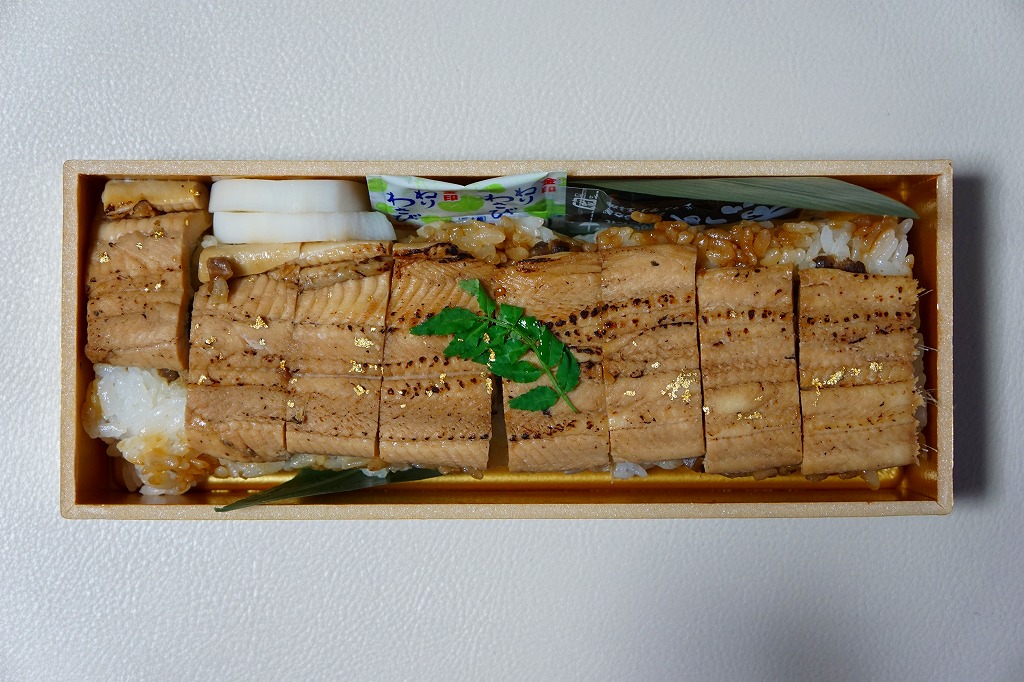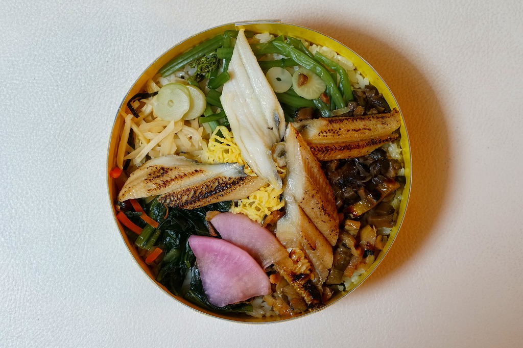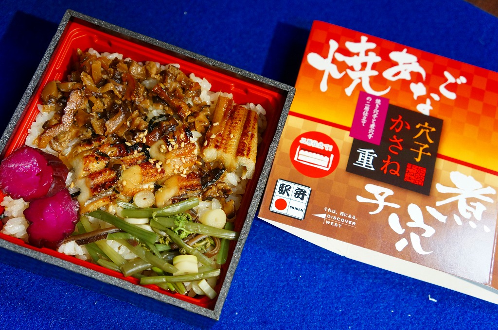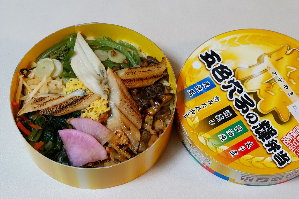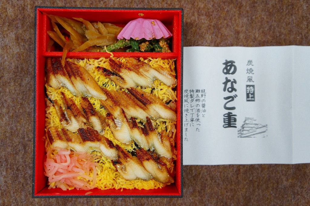 2014(平成26)年1月の京王百貨店の駅弁大会と阪神百貨店の駅弁大会でデビューか。上げ底を加えて高さのある容器に、だし飯を詰め、煮アナゴを載せ、その上にまただし飯を詰め、焼アナゴと山菜と漬物を載せる。アナゴの量は面積で、上層で2/3、中層で1/3程度と多くはないが、アナゴを刻んだり焼いたり煮たりしていて、それらの味の変化を楽しめた。価格は2014年の購入時で1,200円、2017年時点で1,240円。2019年までに終売か。