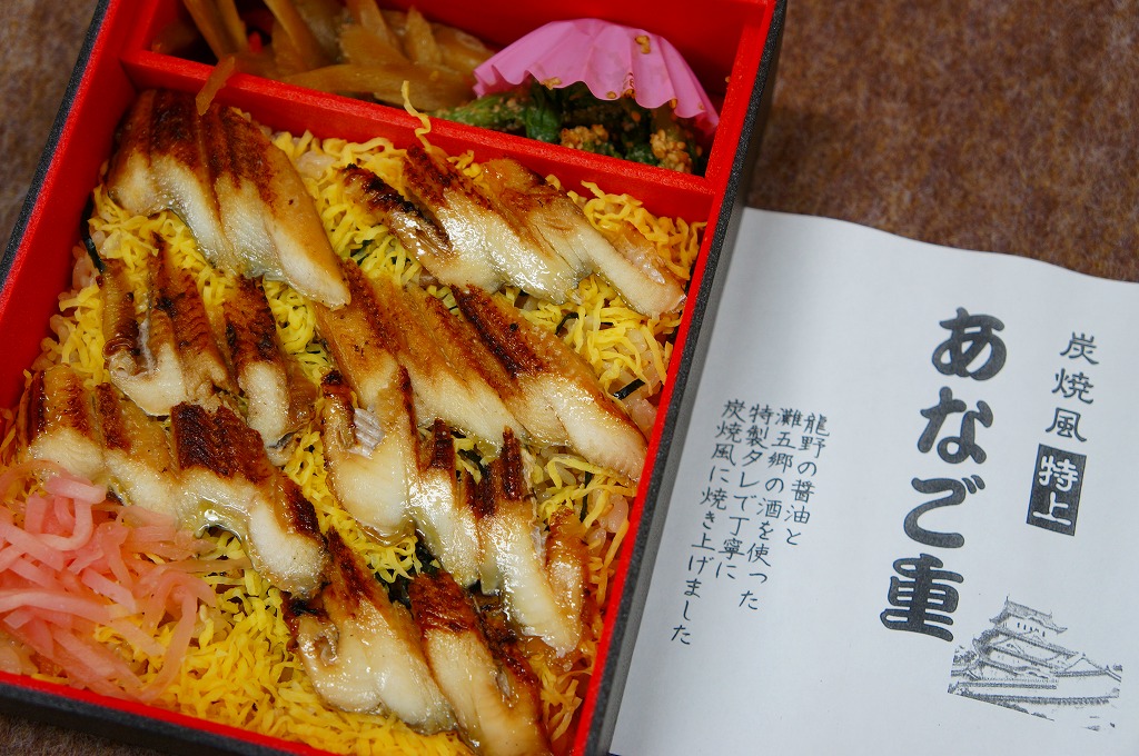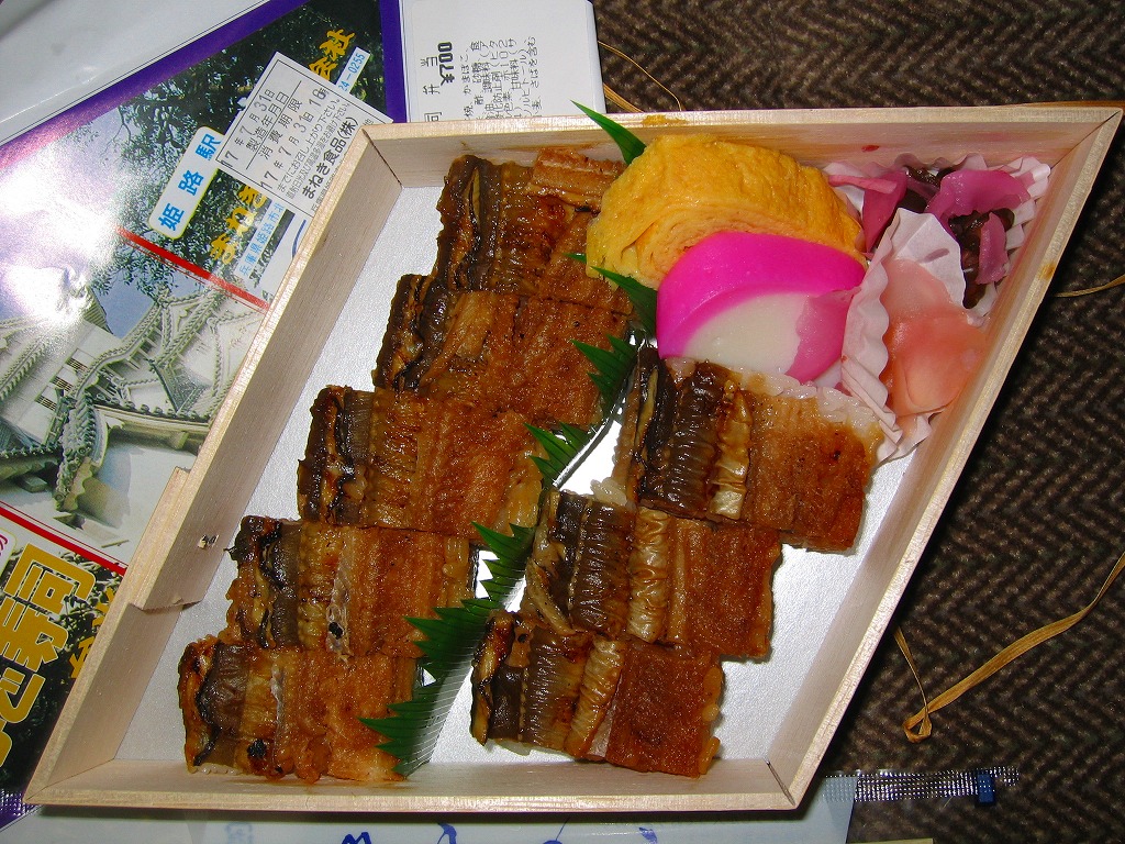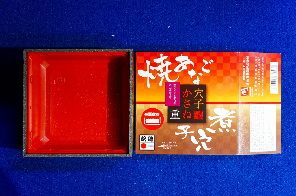 2013(平成25)年1月の京王百貨店の駅弁大会で、姫路駅の駅弁として実演販売されていたお弁当。出汁飯に刻み海苔と錦糸卵を敷き、炭焼き風のアナゴを貼り付け、きんぴらごぼうなどを添えるもの。薄手の焼アナゴは柔らかく上品も、分量が飯にだいぶ負けている。掛紙によると調味料にもこだわったのだろうが、値段にも負けたと思う。そもそもこれは催事専用商品である可能性が高いと思う。姫路駅の本物のアナゴ駅弁はこんなものではない。他の場所で売られたという情報は、目にしていない。