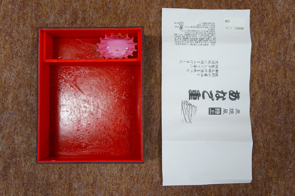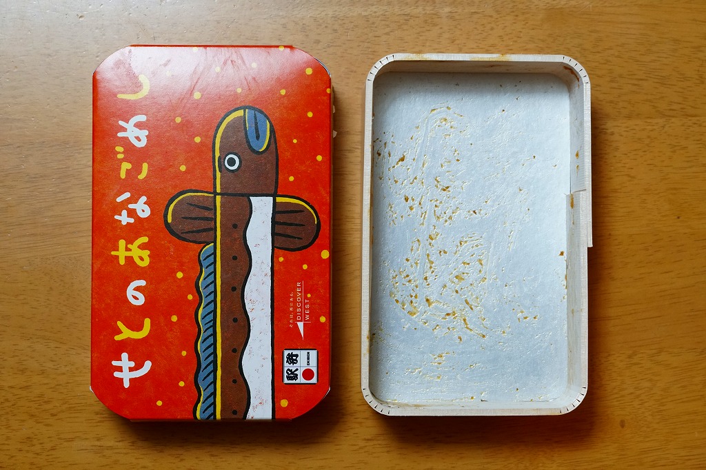 上げ底と上げ蓋で小さなカップに入る中身は少量で、御飯にはえきそばの味を感じられず、玉子焼はだいぶ甘く、硬めのアナゴは「穴子重」を名乗る量でない。現地のアナゴ駅弁はもっとうまい。確実に催事受けする商品であると思うが、味でも注目度でも、以前の陶器の姫路城のほうが良かったような気がした。年内で終売か。