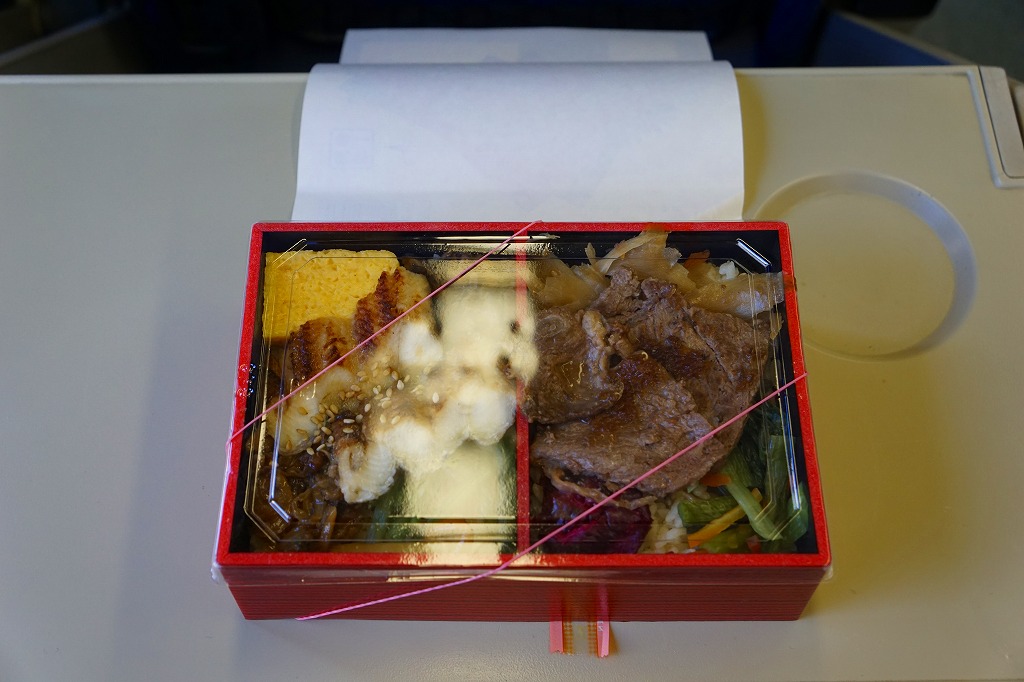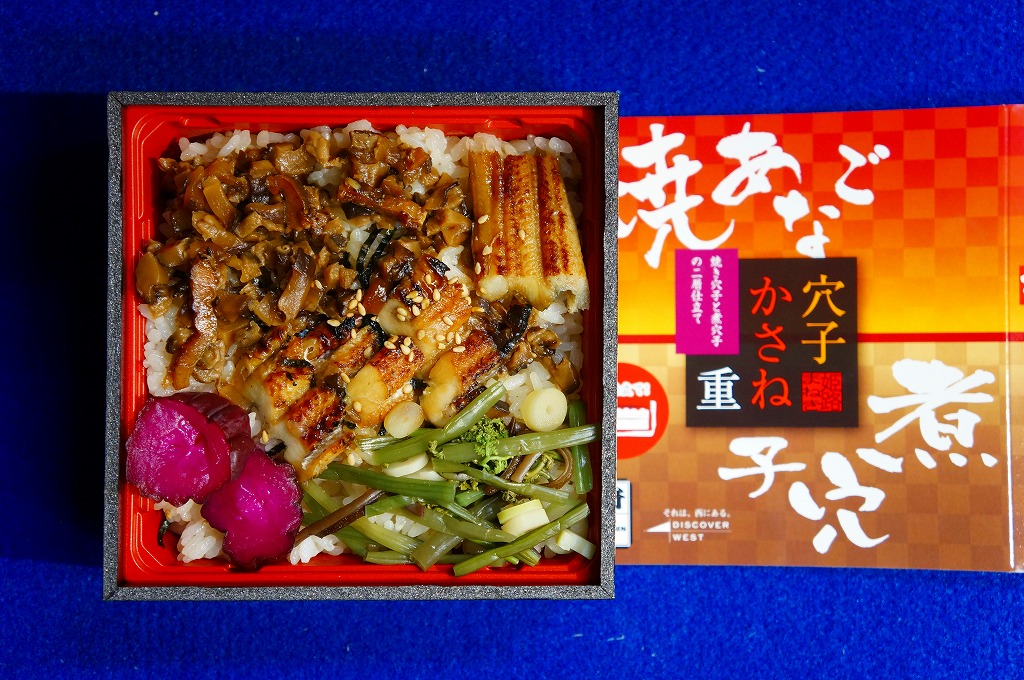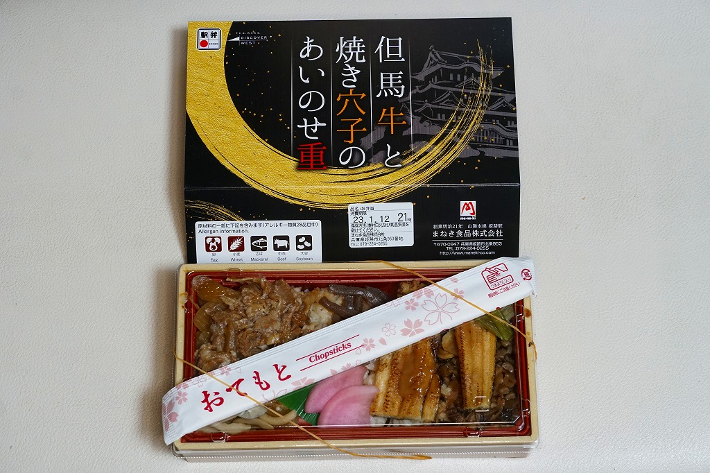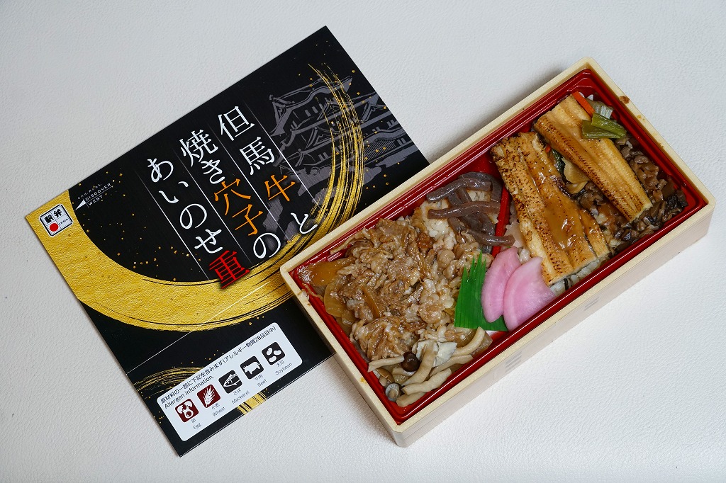 2020(令和4)年1月の京王百貨店や阪神百貨店の駅弁大会で発売。長方形の容器2区画にだし飯を詰め、一方を但馬牛とごぼうの煮物、タマネギ炒め、こんにゃく、ひらたけで覆い、他方を焼穴子、椎茸煮の刻み、小松菜漬、大根甘酢で覆う。つまり小さな牛丼とアナゴ丼が半分ずつ。牛肉でも穴子でもない具と味が強めなのは、邪魔なのか変化なのか。