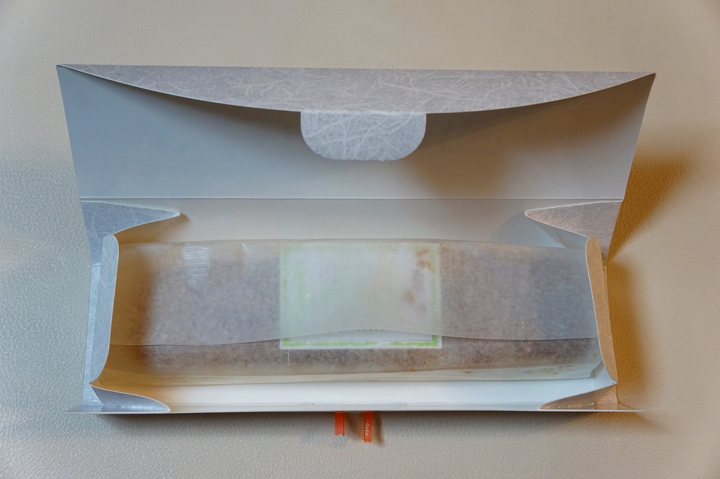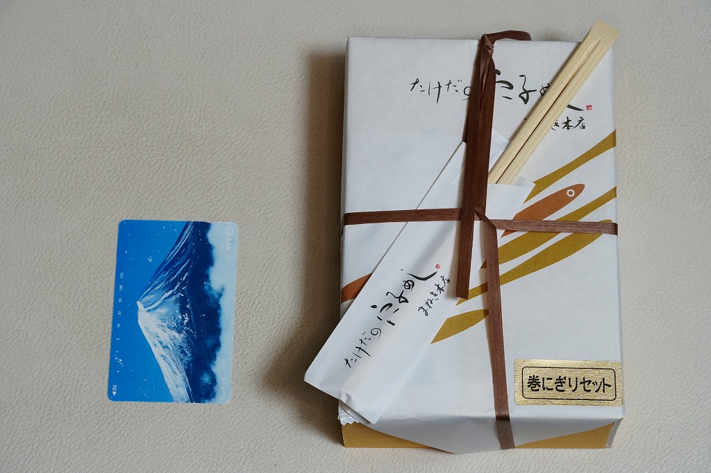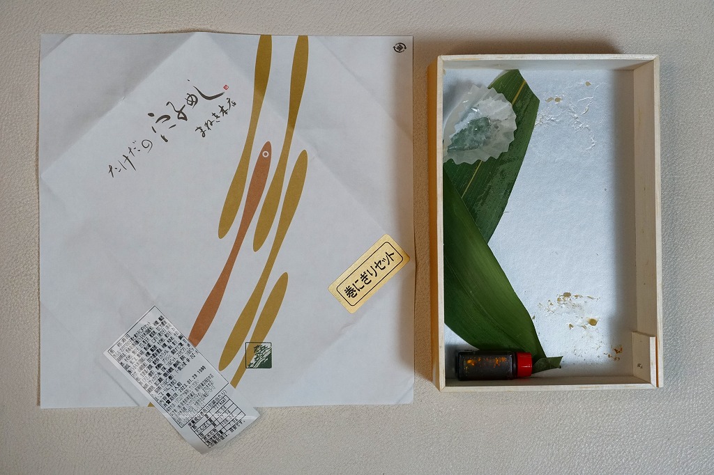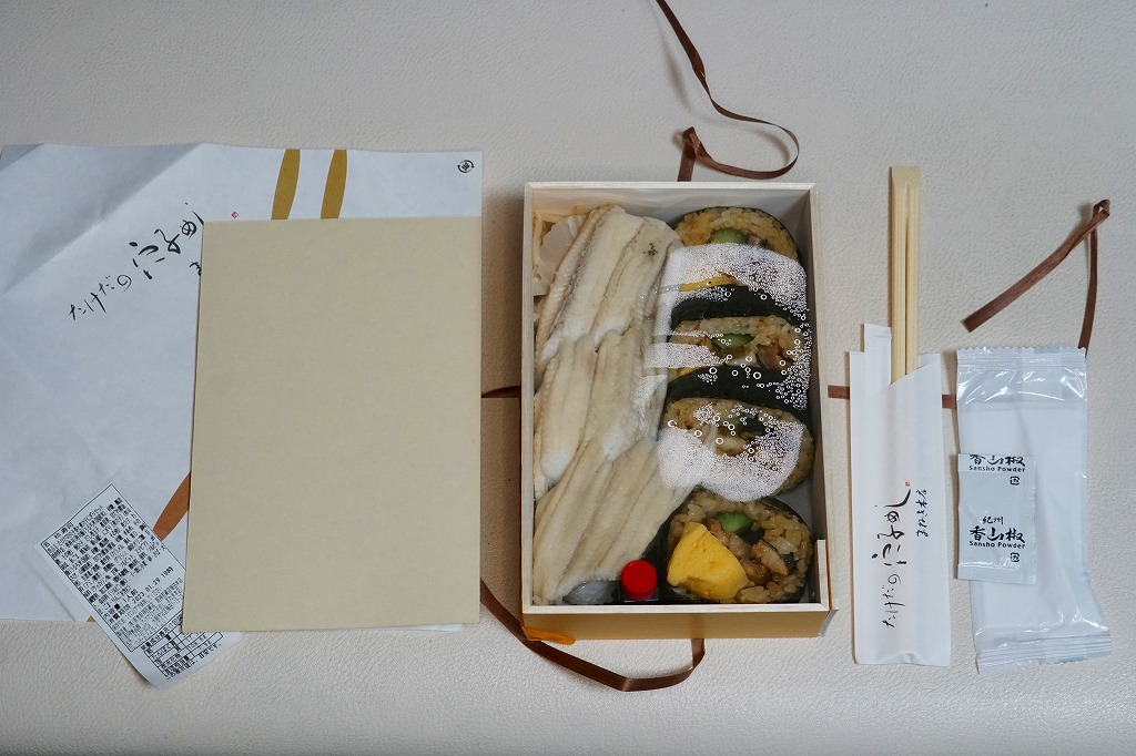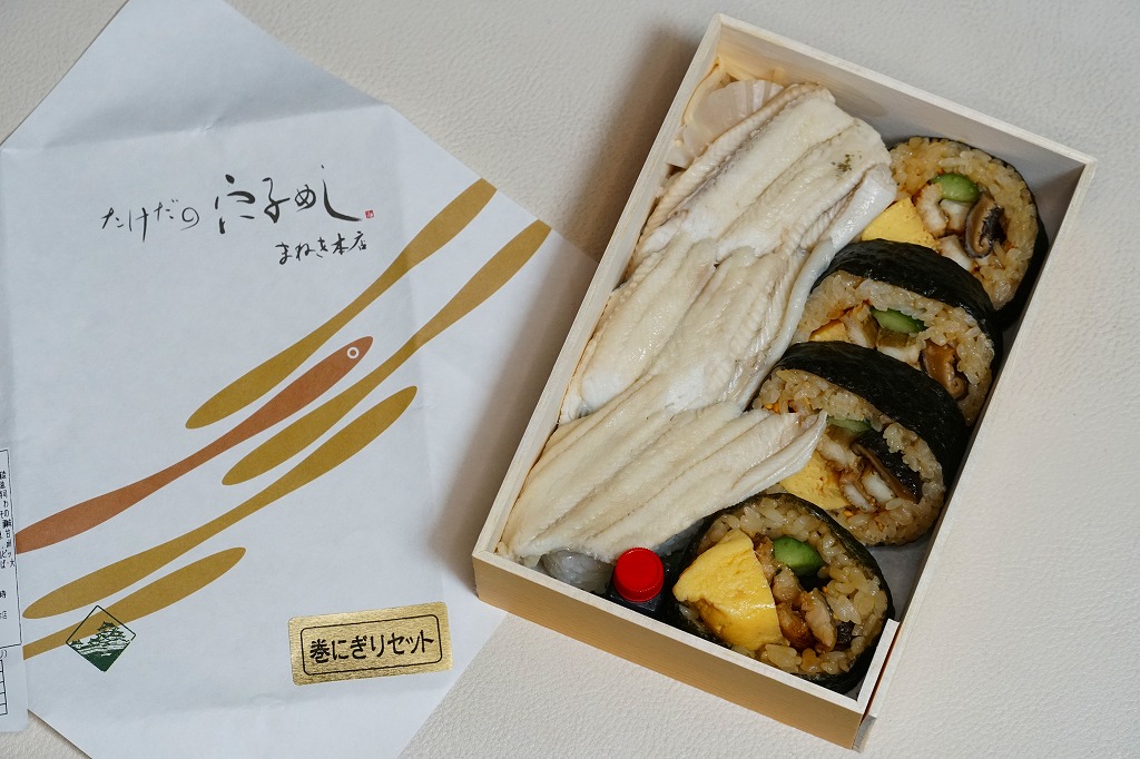 上記の駅弁「たけだの穴子めし」の「巻にぎり」セット。食品表示ラベルでの商品名は「たけだの穴子巻と煮穴子にぎりセット」。その名のとおり、上記の(小)と同じ掛紙で包んだ同じ容器に、煮穴子にぎりが3個と、焼穴子に玉子焼や椎茸などを合わせた太巻きが4個。淡く柔らかい風味と、容赦ないお値段。