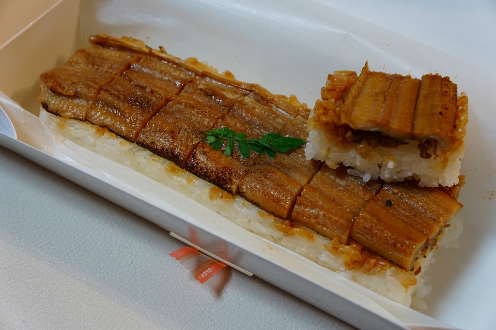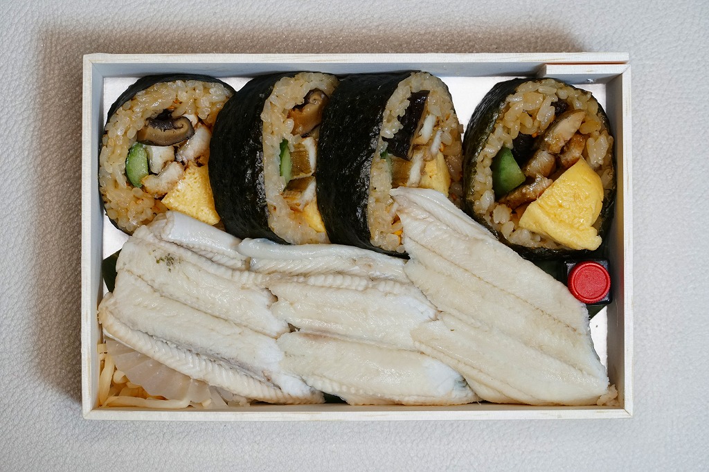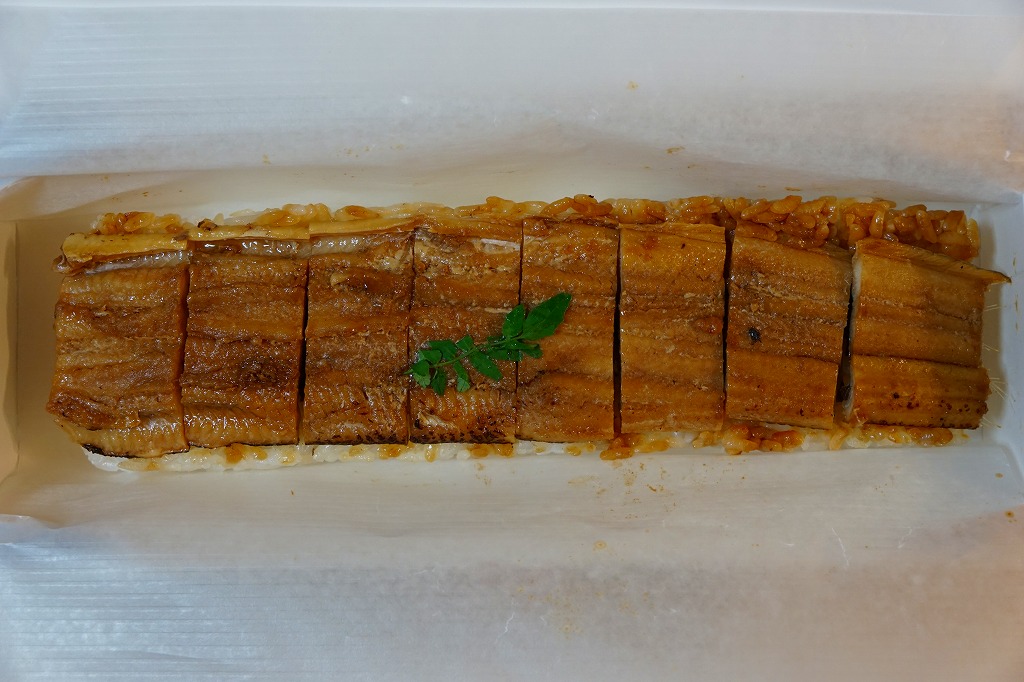 1959(昭和34)年に発売し、昭和50年代に現在の姿へ変更。細長いボール紙の容器の中に細長い穴子寿司が横たわる。椎茸と山椒の煮物を入れた、ほんのり酸っぱい酢飯と香ばしいタレと軽くお焦げが付くまでしっかり焼いた穴子蒲焼が口の中でぴったり合う。購入時は高く感じる価格にも納得。価格は2001年12月の購入時で1,200円、2010年時点で1,300円、2014年時点で1,350円、今回2017年1月の購入時で1,800円、2025年時点で1,850円。