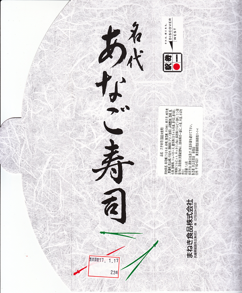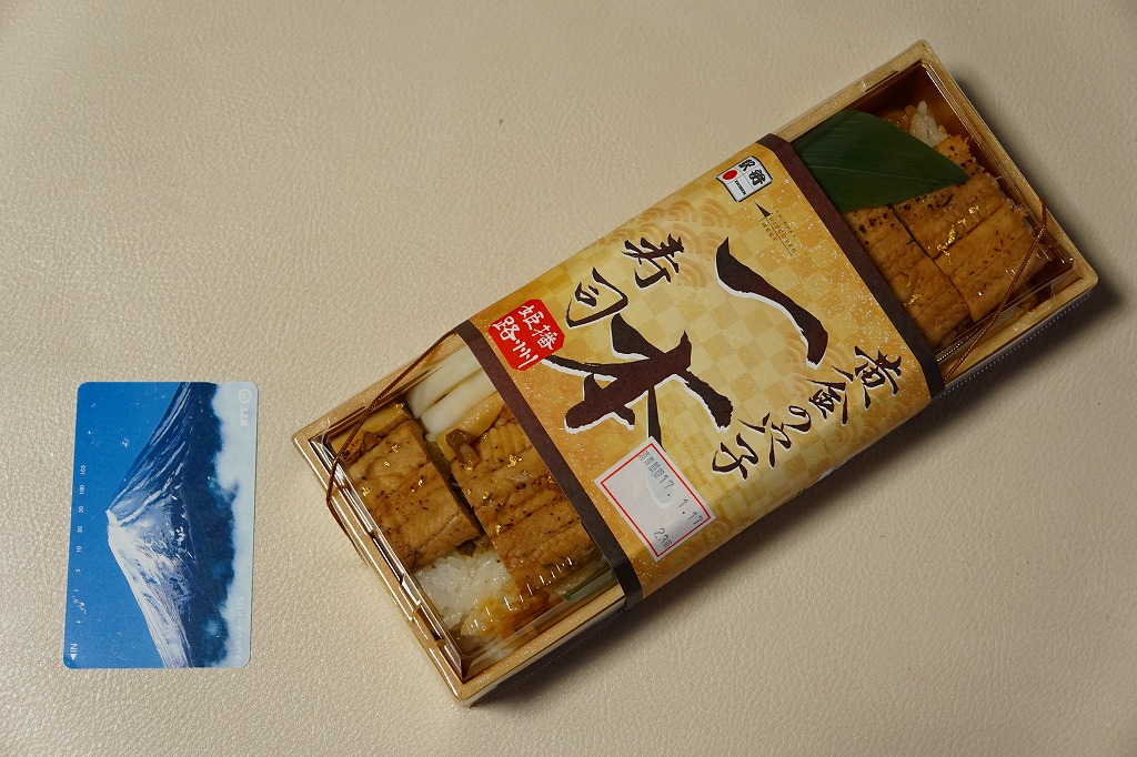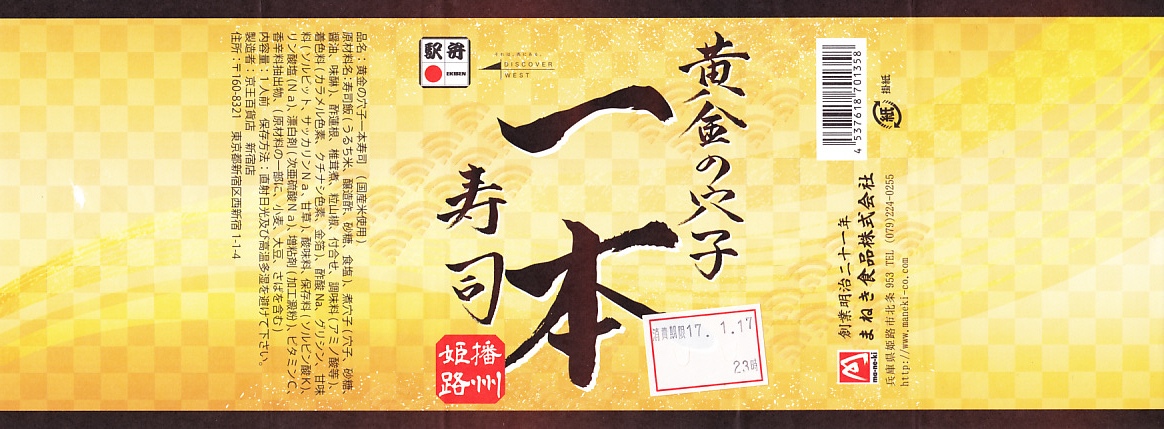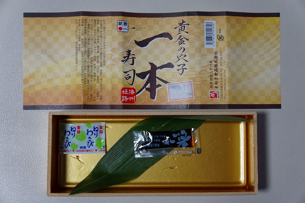 2017(平成29)年1月の京王百貨店の駅弁大会でデビューか。目玉の駅弁対決の二番手「海の幸黄金の弁当対決」として、西明石駅、福井駅、京都駅の駅弁と、実演販売で対決した。細長い容器に、アナゴの棒寿司を一本、シイタケ煮を挟んで、8切れにカットして、金粉をふりかけて、タレとワサビとダイコンを添えて、笹の葉の上に置く。中身はつまり、姫路駅弁の隠れた名作「名代あなご寿司」と、だいたい同じもの。今回買ったものは、見た目にふんわり柔らかそうで、食べたらそうでもなし。