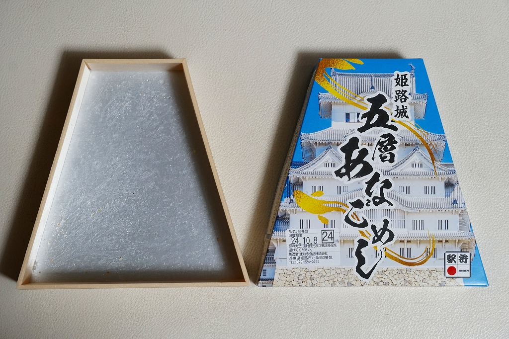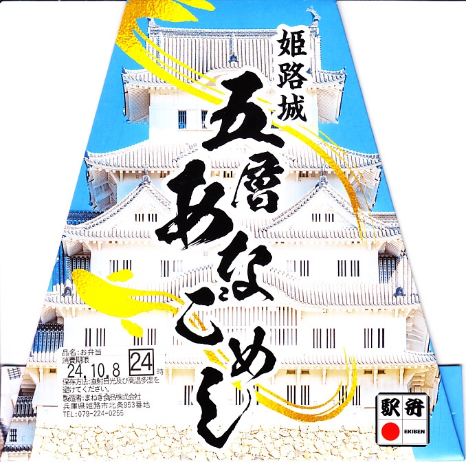 秋冬の駅弁大会シーズンに向けた、2024(令和6)年10月の新商品。同月のJR東日本の駅弁キャンペーン「駅弁味の陣2024」にエントリーし、姫路駅や東京駅や全国各地のスーパーで発売。ふたには姫路城の白い大天守を描き、これに合わせて容器の形は台形に。この容器にだし飯を詰め、焼穴子と玉子焼を交互に5回ずつ敷き重ねる。蒲焼のたれと山椒を別添し、中身をこの5種に限った。五層城である国宝姫路城をイメージしたことが、誰にでも分かりやすい。下記のとおりアナゴが得意な姫路駅弁なので、身に加えて玉子の追加で柔らかい味もいけて、なかなかの値段でその分量もしっかり。容器にこだわるよりシンプルに、名城が表現された。