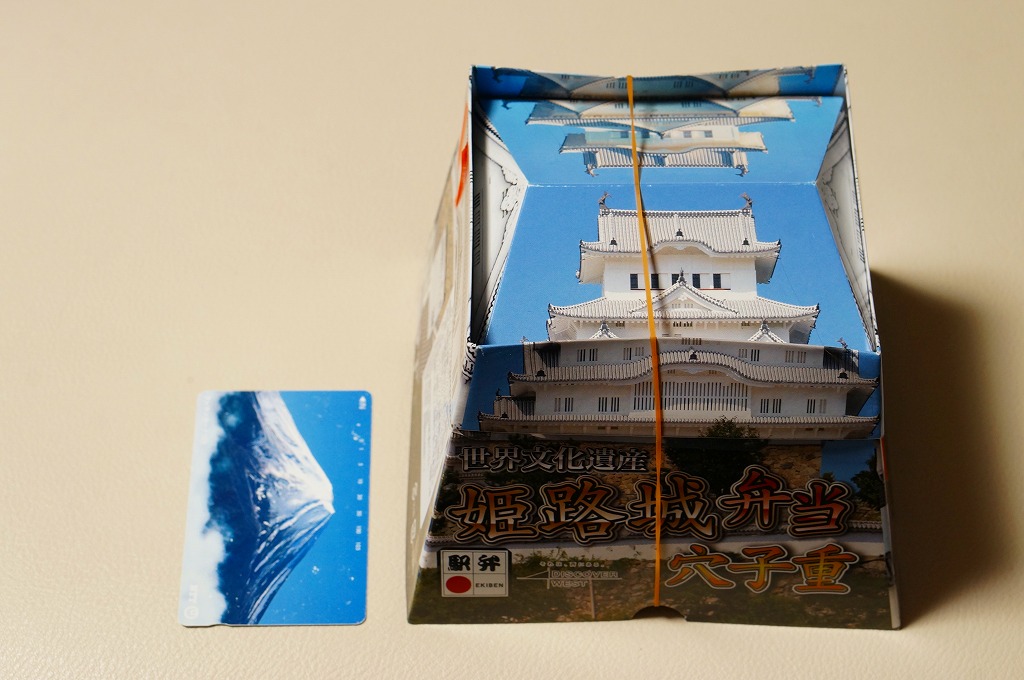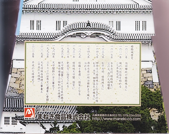 2015(平成27)年1月8日に京王百貨店の駅弁大会での実演販売でデビュー。現地でも同日に発売。四方からの城の写真を印刷した厚紙を、組み立てて重ねることで姫路城を模す。中身は姫路駅名物「えきそば」で使うだし汁で炊いた御飯に、玉子焼、アナゴ焼、大根漬を折り重ねる。