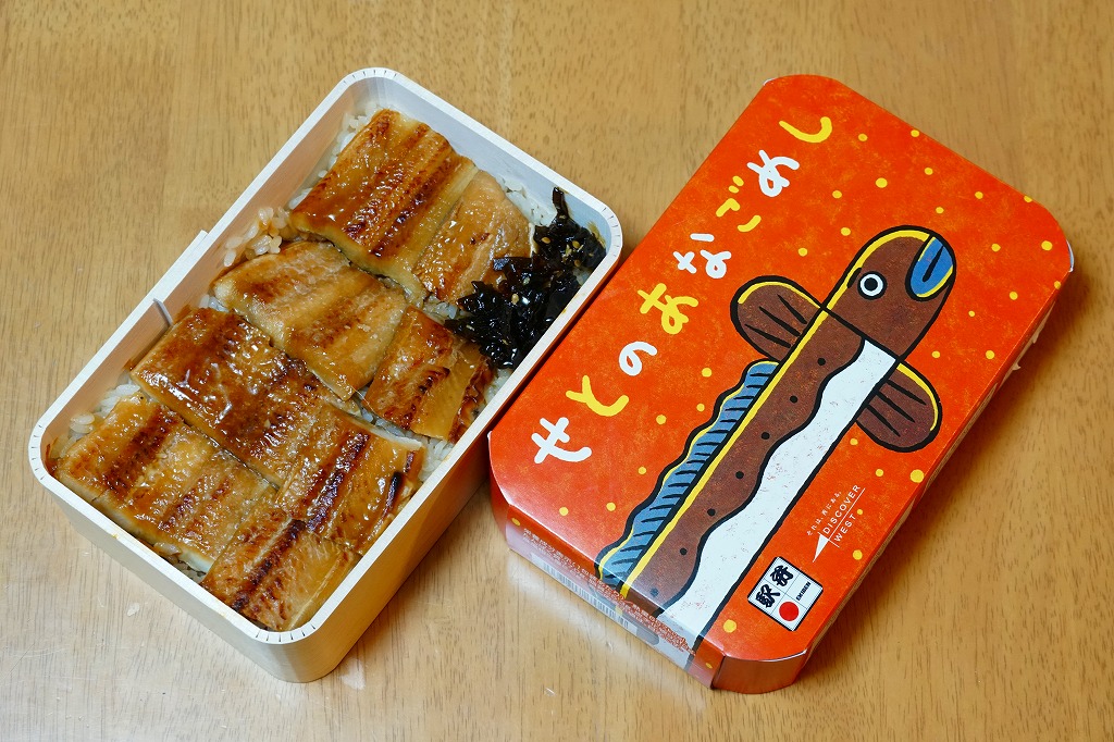アナゴを描くふたの絵柄は、駅弁の掛紙というよりはむしろ絵本の表紙。中身は白飯を焼きアナゴで覆い、ごま昆布のみを添える、古めのアナゴ駅弁で定番のつくり。焼きアナゴというよりはむしろ、煮魚の味を持っていた。2023年度までの販売か。