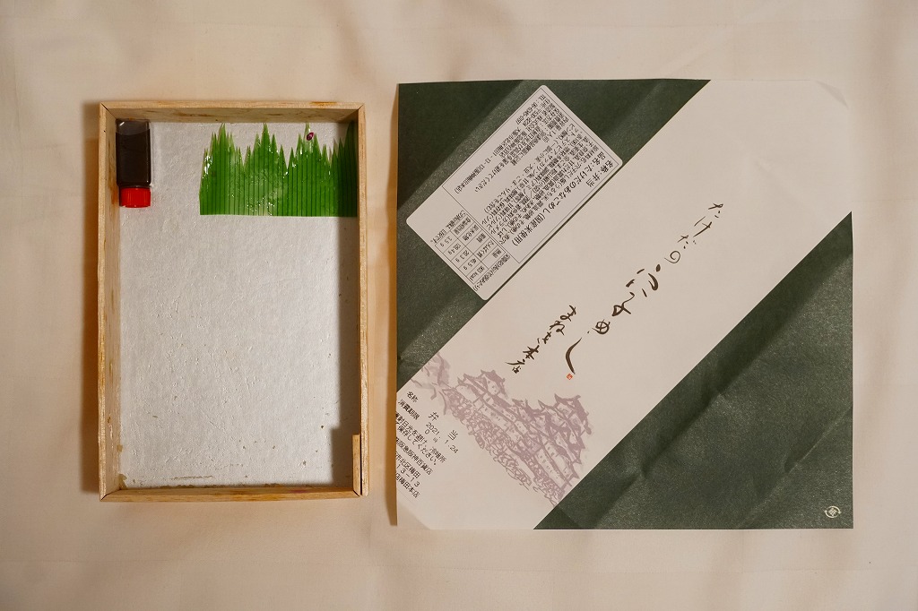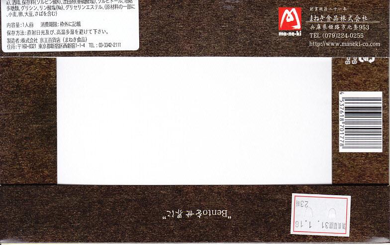 菱形の経木枠の容器に木目調の紙のふたをかけて、昔も今も将来も姫路名物である姫路城の写真を載せた掛紙で割りばしごと包み、紙ひもで留める。中身は穴子の押寿司というかバッテラを8切れ詰め、蒲鉾と玉子焼きを添える。見た目のままの風味は良好。調製元はこの頃から四辺形の容器が好きだったようだ。
