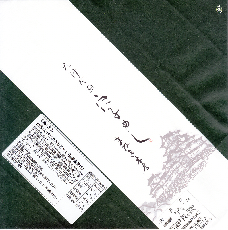 四角い容器に、兵庫米きぬむすめを使う穴子だし飯を詰め、煮穴子で覆い、奈良漬と柴漬けと生姜を添える。アナゴは柔らかくも固くもない、かまぼこのような弾力感。「たけだ」は、1888(明治21)年に調製元を創業し、現在は6代目の竹田家にちなむものだと思われる。価格は発売時や2021年の購入時で1,782円、2022年時点で1,998円、2025年時点で2,160円。