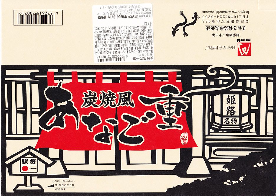 2001(平成13)年12月30日に購入した、姫路駅弁のふた。当時は楕円形の容器をラップで包んでおり、絵柄はふたに直接印刷され、アナゴの隣に鳥そぼろと山菜が配置されていた。東京発の夜行列車「サンライズ出雲」を姫路駅で降りたのは朝5時半で、駅とその周辺に開いている店がひとつもなかったのに、駅弁屋は開いており、このような駅弁を買えたことが印象的だった。