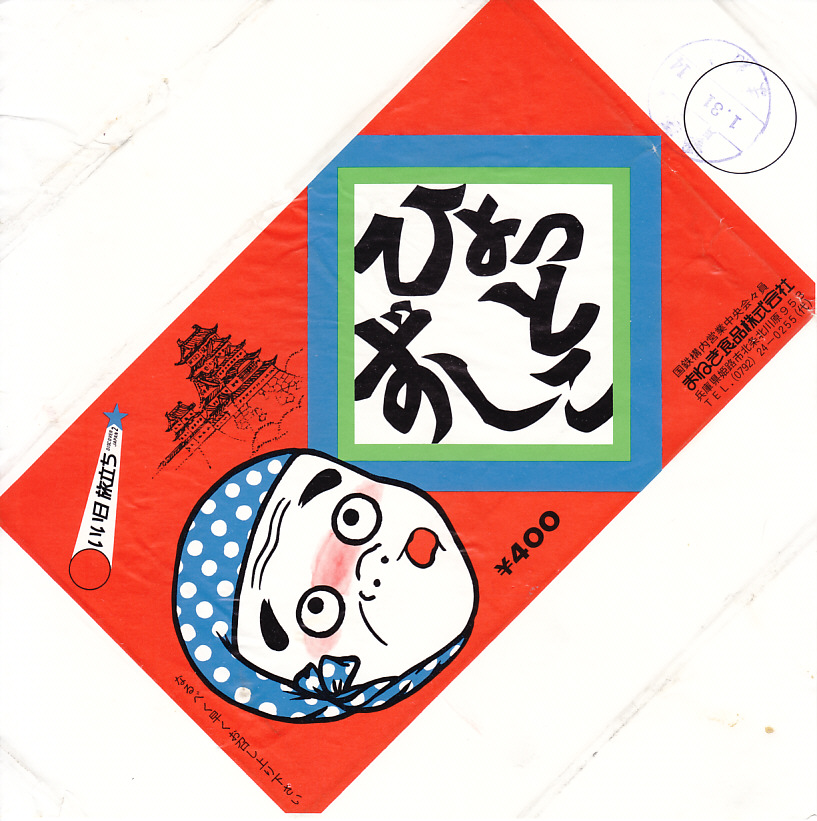 1980(昭和55)年1月31日14時の調製と思われる、昔の姫路駅弁の掛紙。この駅弁は昭和50年代に売られ、中身はバッテラ、いなりずし、巻き寿司、おすしの盛り合わせだったという。現存する「おかめ弁当」と対になる存在だった模様。掛紙には姫路城が当然のように描かれている。