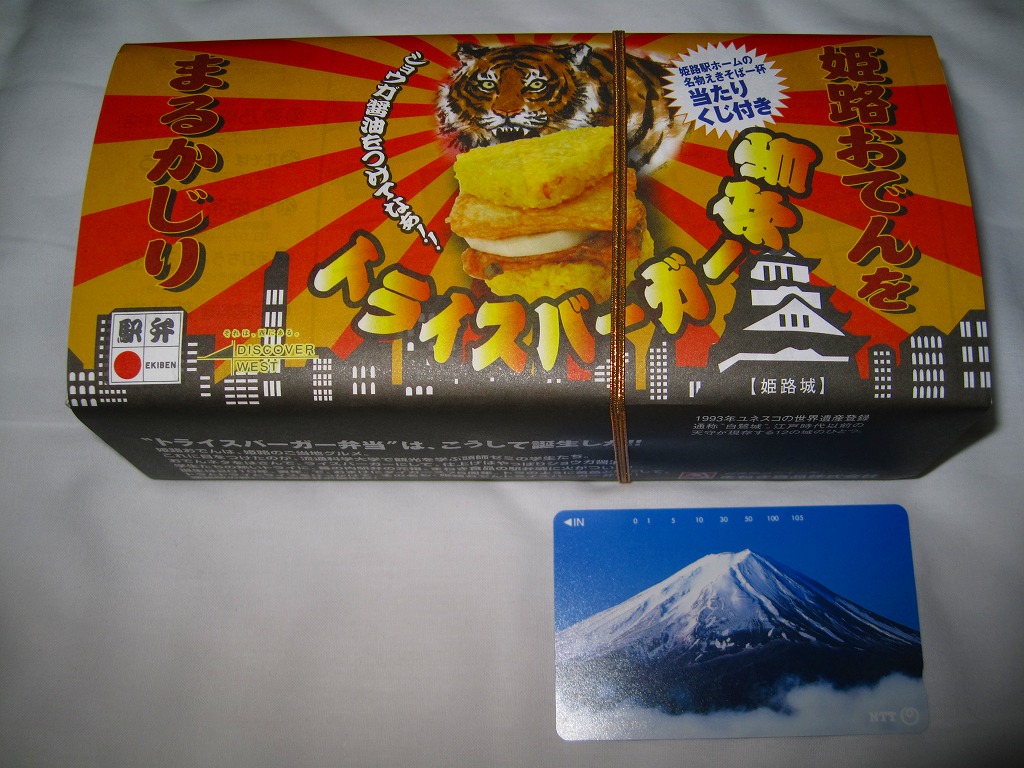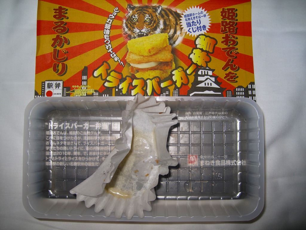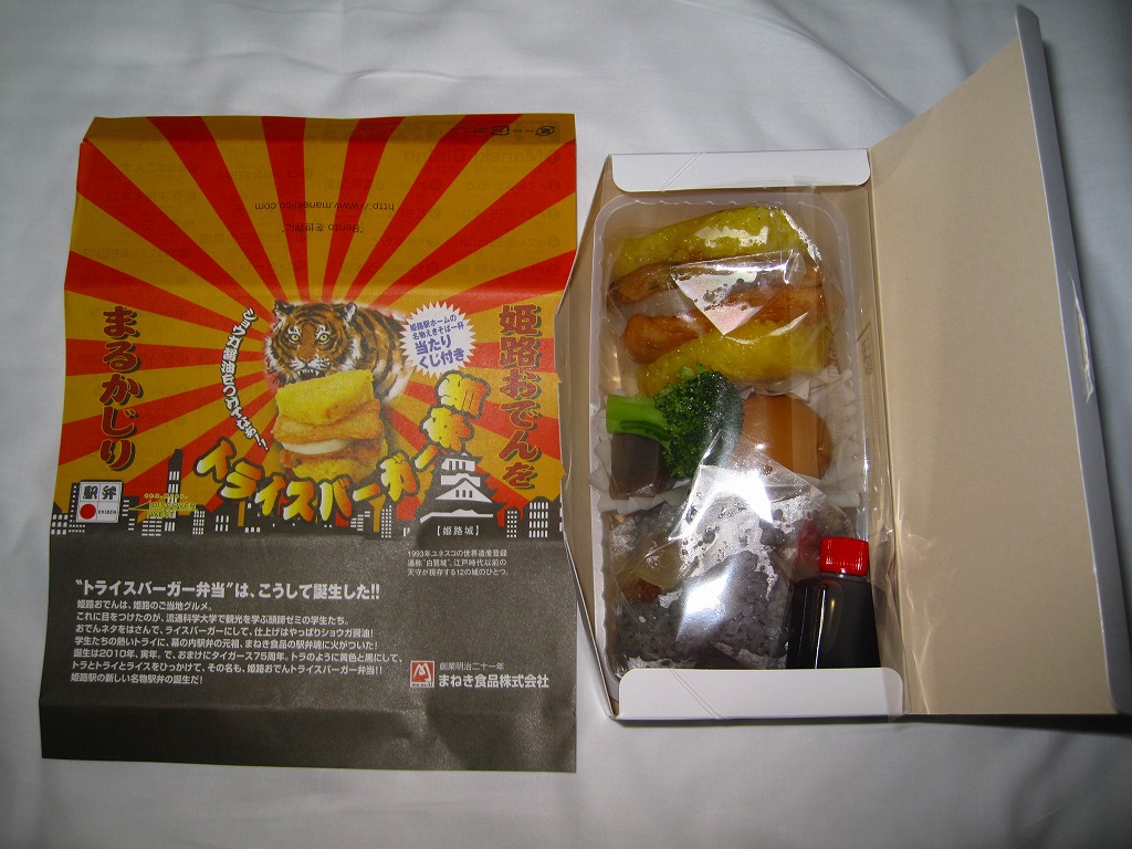 2006年から地域ブランドとして売り込み中の姫路おでん。姫路城大天守保存修理事業に伴い2010年4月から2014年度まで続く見込みの見学中止により観光客の減少が懸念される姫路で、これを新たな観光資源にしようというコンセプトで、この弁当は開発されたそうな。商品名にはトラとトライとライスバーガーを合わせたという。