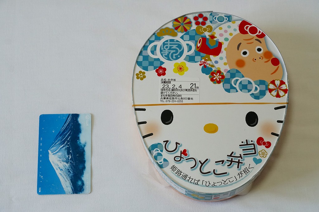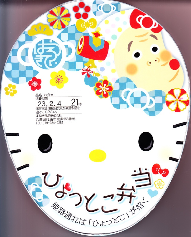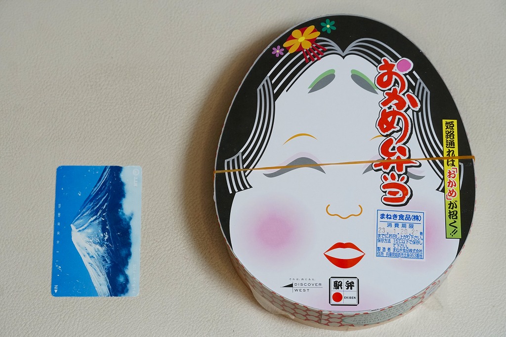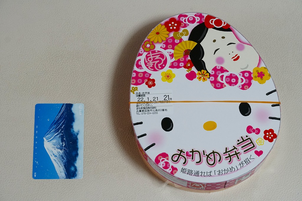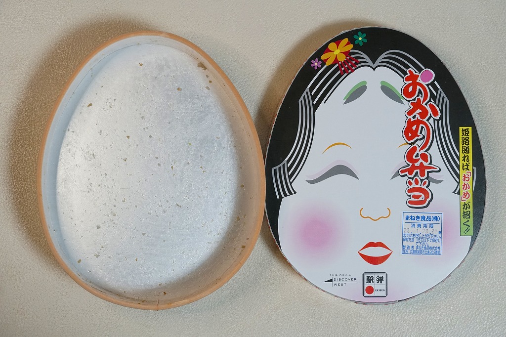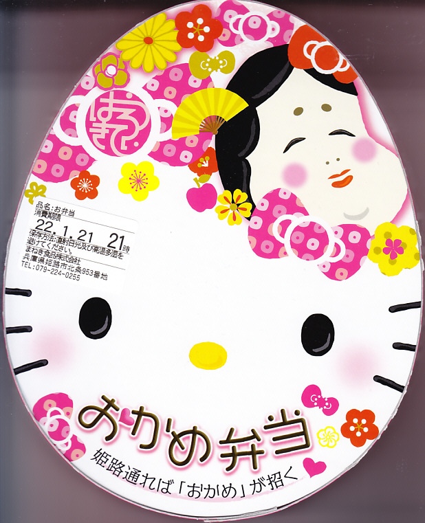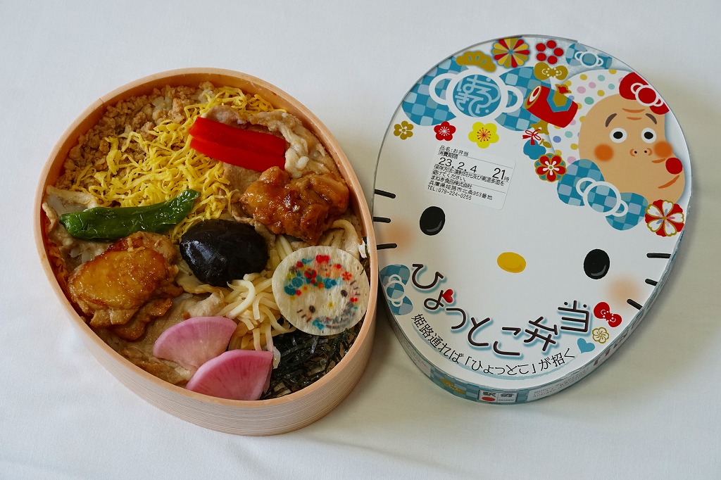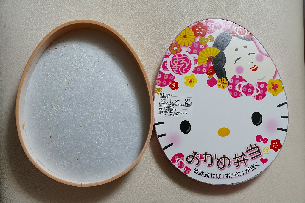 秋冬の駅弁大会シーズンに向けた、2021(令和3)年秋の新商品か。姫路駅で半世紀近い歴史を持つ駅弁「おかめ弁当」の、現在の卵形の容器のふたを、サンリオのキャラクター「ハローキティ」の顔のような絵柄にした。おかめ弁当とハローキティの生まれ年は同じ1974(昭和49)年かもしれない。