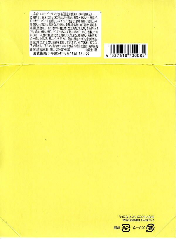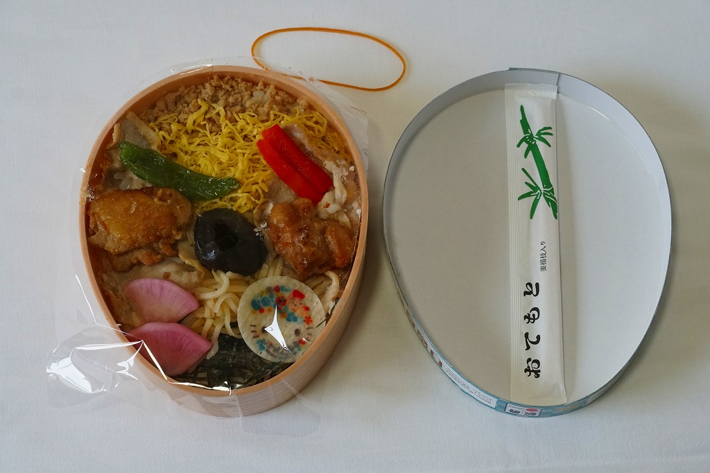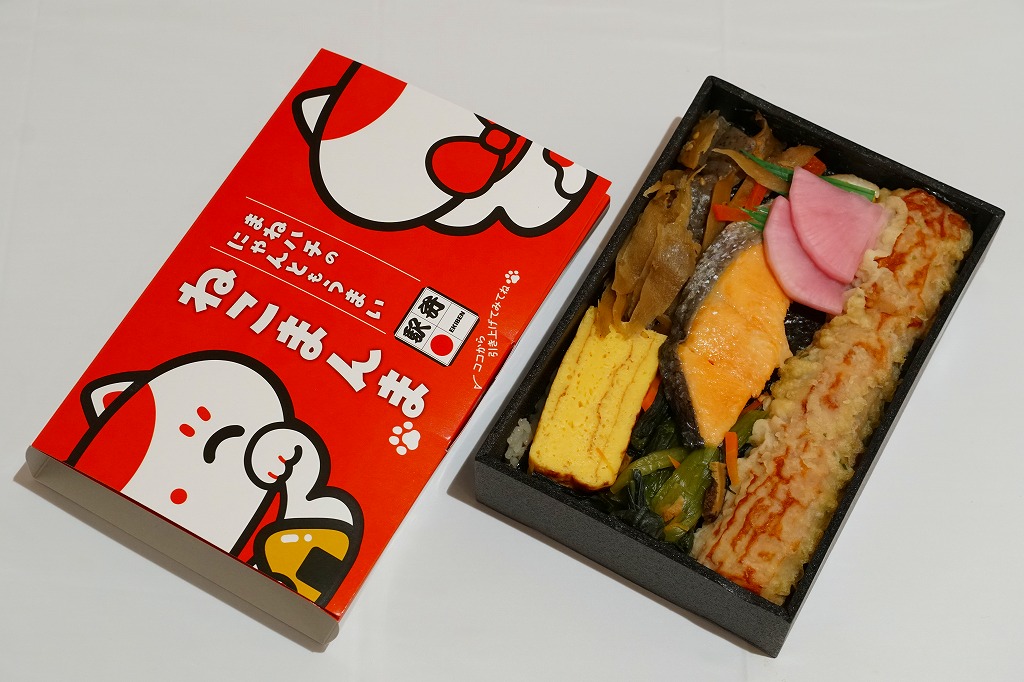 この容器に出汁飯を詰め、鶏照焼、豚しょうが焼、鶏そぼろ、錦糸卵、生姜、刻み海苔、しいたけ、ししとう、大根桜漬などで覆う。あちらのおかめ弁当と同じく、中身だけを見れば、キャラクターの世界観やかわいらしさに子供やファミリー向けの要素などまるでない、コンセプトを見いだしにくい肉と飯のお弁当。腹には溜まりそう。2024年までの販売か。