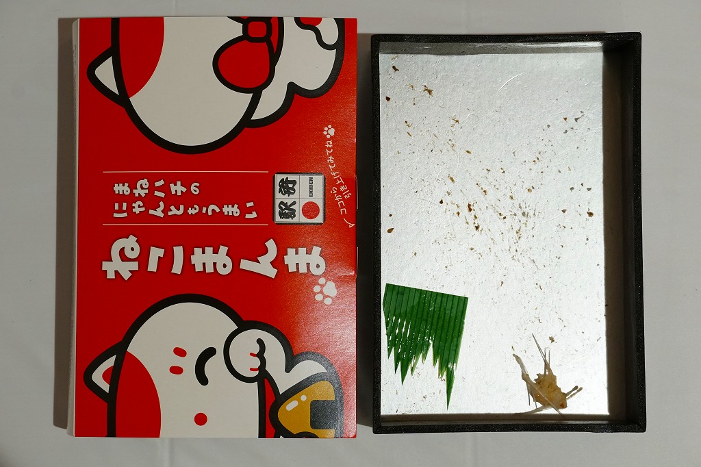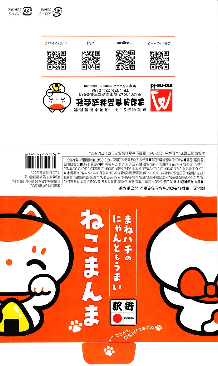2025(令和7)年1・2月の鶴屋百貨店の駅弁大会で、姫路駅の駅弁として実演販売。スリーブに描かれるネコのキャラクター「まねハチ」は、2022年9月に誕生した調製元のマスコットキャラクターと書いてあり、他の姫路駅弁の外箱にも描かれる。浅く平たい四角形の容器にだし飯を詰め、かつおぶしと海苔で覆い、銀鮭の塩焼き、ちくわ磯部揚げ、厚焼き玉子、小松菜漬、きんぴらごぼう、甘酢大根で覆う。つまり、中身は「ねこまんま」でなく海苔弁だった。姫路や関西地方にも公式サイトなどの案内にも出てこない、駅弁大会のチラシやリストにも載らなかった、謎の商品。