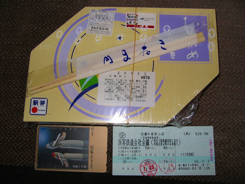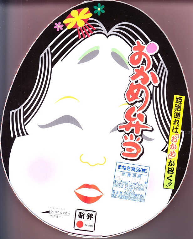 2004(平成16)年7月25日に購入した、姫路駅弁のふた。おかめ弁当の内容はおおむね変わらないが、容器や形状は時代により大きく異なる。この時はJR西日本の駅弁キャンペーン「駅弁味の陣」が開催中で、その応募シールがこのふたに貼られていた。駅弁マークも追加された。