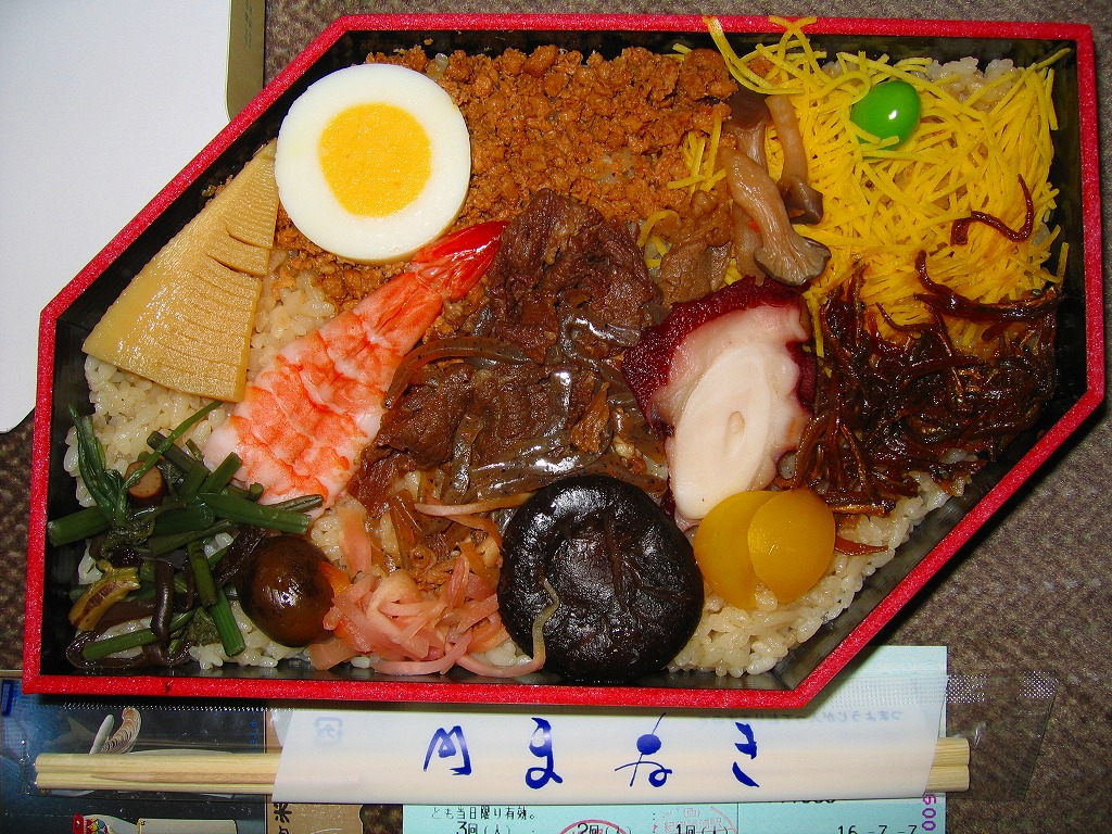 2014(平成26)年のNHKの大河ドラマ「軍師官兵衛」(ぐんしかんべえ)の放送に合わせて、前年2013(平成25)年の8月から2014年12月まで販売された期間限定駅弁。もしかすると、半年ほど早く売り止めたかもしれない。ひょうたん(ひさご)型の容器の3区画にそれぞれ、アナゴ飯、ちらし寿司、菜の花ごま和えときんぴらごぼうを詰めている。アナゴ飯は焼きアナゴもだし飯もたっぷり、ちらし寿司もタコにエビにサバにと具がちょっと豪華で、一食分には重いかなと思うくらいのボリュームがあった。