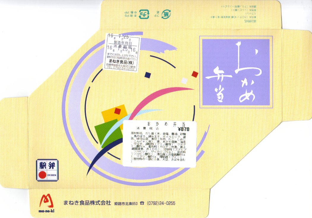 1970年代、昭和50年前後の、2月18日4時の調製と思われる、おかめ弁当の掛紙。鉄道に関する記述がないため、駅弁でなく仕出し弁当の掛紙だと思う。姫路駅にしかない駅弁「おかめ弁当」の名前を持つ。ここに「この弁当の名付親は藤浦洸先生」という、駅弁の記事や文献などで見たことがないことが記された。戦前戦後の昭和時代に美空ひばりなどのヒット曲を量産した作詞家の藤浦洸(ふじうらたけし)のことか。「ひめじ通ればおかめがまねく」のキャッチフレーズもある。