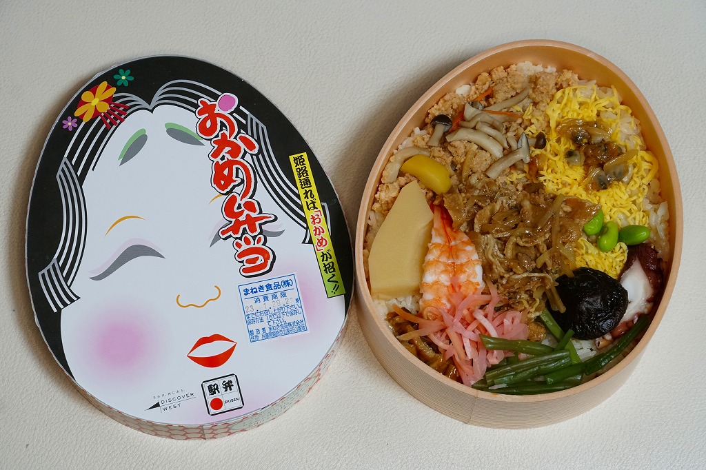 1974(昭和49)年頃に発売か。容器は2007年までに、この卵形でおたふく顔の専用品になり、「姫路通れば「おかめ」が招く!!」という、昭和時代からのキャッチフレーズを記した。この容器に出汁飯を詰め、牛肉ごぼう、鶏そぼろ、タケノコ、椎茸、タコ煮、酢エビ、あなご、くり、しめじ、錦糸卵などを散らす。多種多様のおかずを載せて「おかめ八目」なのだとか。価格は2001年時点で870円、2014年4月の消費税率改定で900円、2019年時点で920円、2022年4月から980円、2024年時点で1,080円。