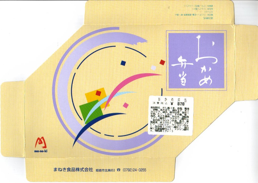 2001(平成13)年12月30日に購入した、姫路駅弁のふた。この当時は姫路駅の他の駅弁でも、この独特な六角形の容器が共用されていたと思う。