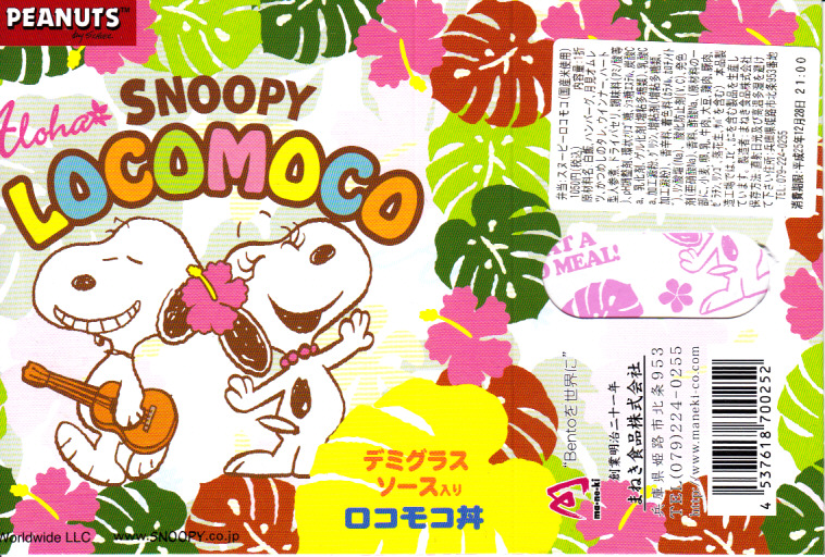 2013(平成25)年の夏頃の発売か。商品名は「スヌーピーロコモコ」とも。キャラクターが描かれたピンク色のプラ製カップに、御飯を詰めてデミグラスソースをかけて、やはりキャラクターを印刷したハンバーグ、丸い目玉焼きというかオムレツ、ソーセージ、ハート形のニンジンを載せる。