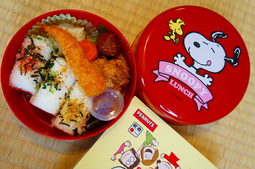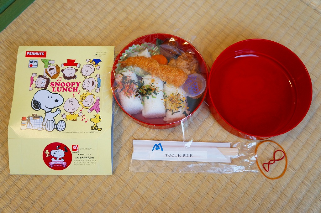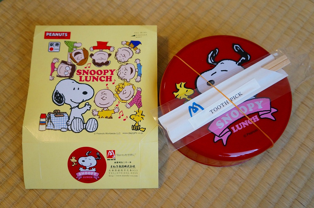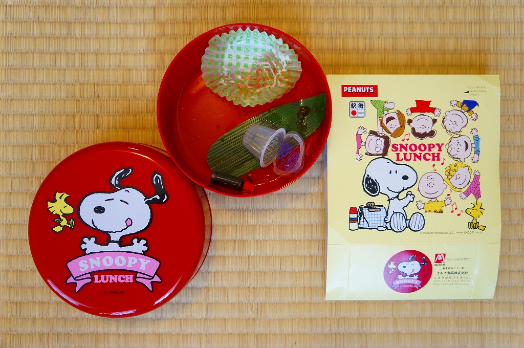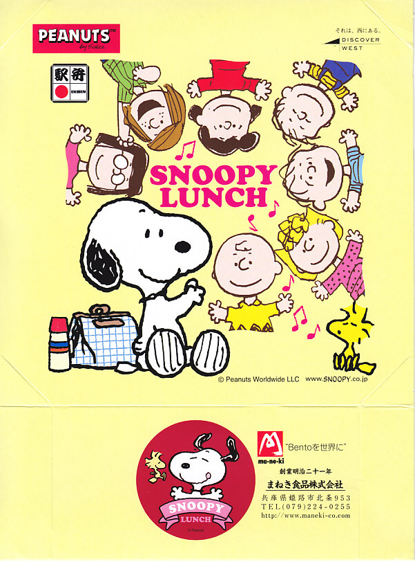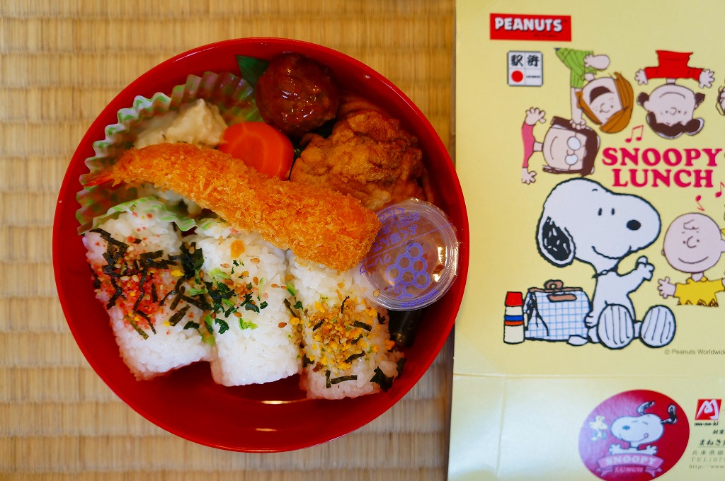 2012(平成24)年9月に姫路駅で主に土日曜日に販売される駅弁として発売したらしいが、東京駅の駅弁売店では8月から毎日販売されている。駅弁の名前は日本でもキャラクター商品や企業の販売促進アイテムなどでよく知られるアメリカ漫画「ピーナッツ」の主人公の飼い犬「スヌーピー」から公式に採用したもので、赤く丸いプラ製容器のふたにはその姿が、ボール紙のパッケージにはその仲間と含めて描かれる。