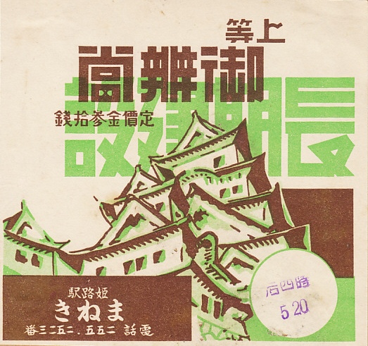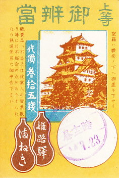 1931(昭和6)年1月17日14時の調製と思われる、昔の姫路駅弁の掛紙。名刺サイズの小さな紙片にもしっかりと、姫路城の天守を描く。調製元のまねきは、今も姫路駅で駅弁を売るまねき食品。