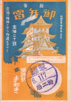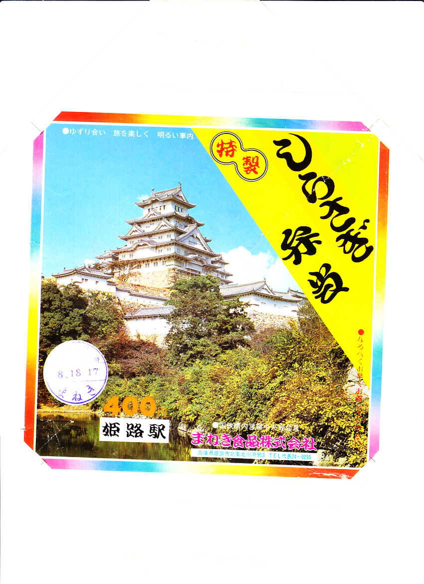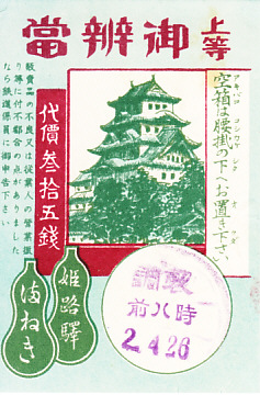 1980年代の、8月18日17時の調製と思われる、昔の姫路駅弁の掛紙。姫路城の別名「白鷺城(しらさぎじょう)」を、並等幕の内駅弁の名前にしたものだろう。姫路城天守の写真を使う。